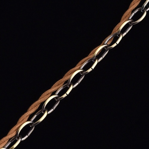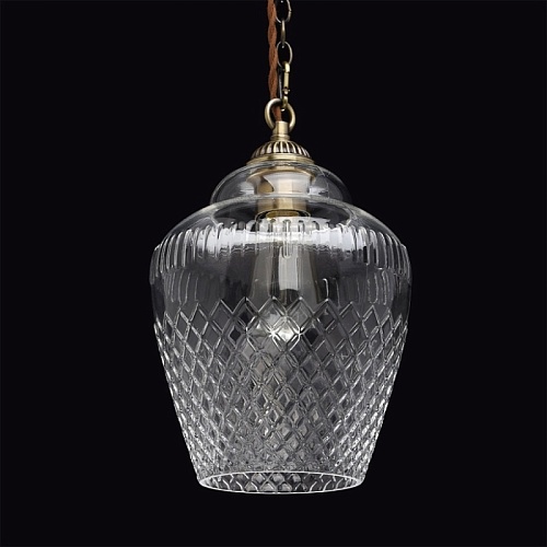Основание светильника выполнено из сплава железа и гальванизирована в цвет античной бронзы с последующим патинированием. Стеклянный плафон отлит в сложную объемную форму. Светильник декорирован винтажным шнуром в текстильной оплетке коричневого цвета.