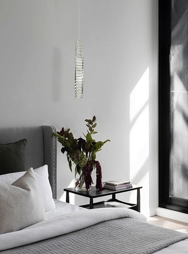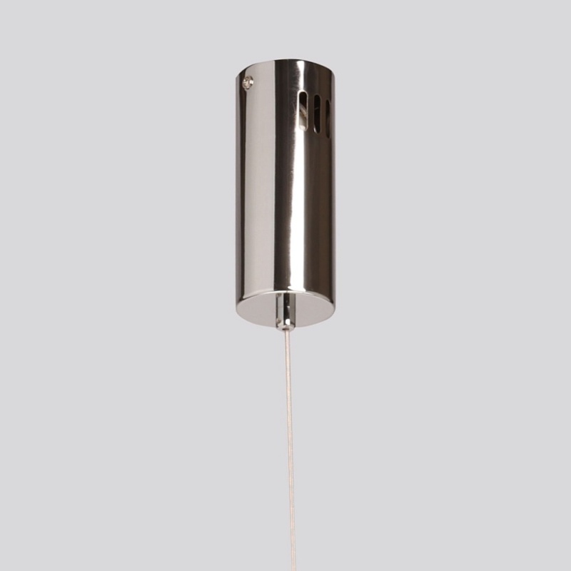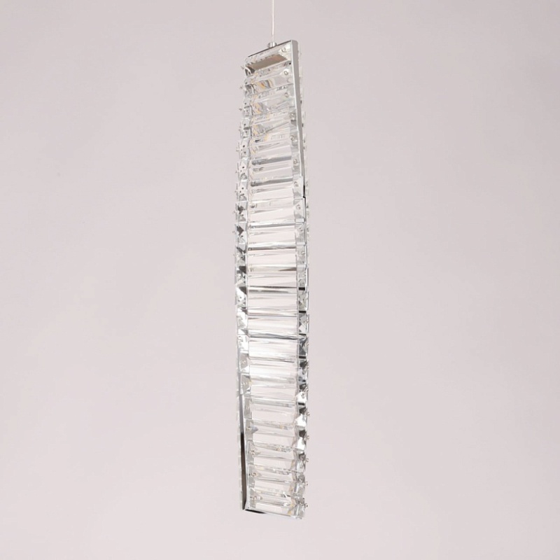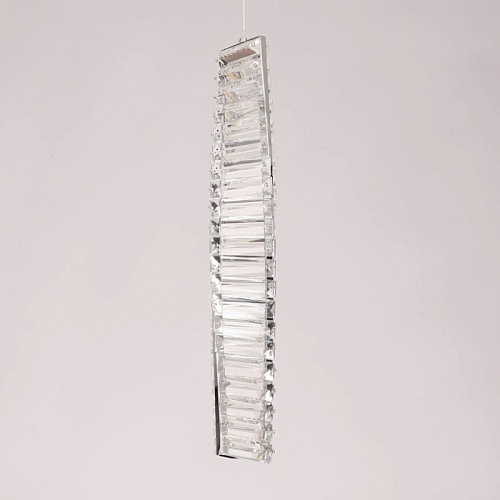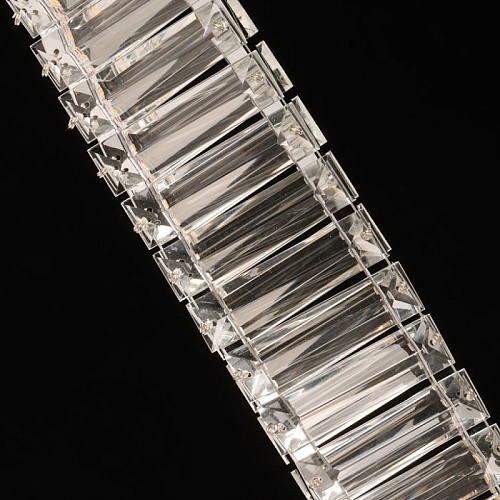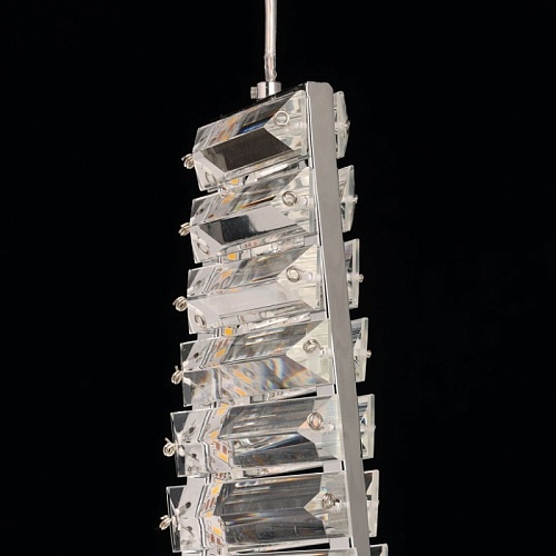Металлическое основание подвесной люстры гальванизировано в цвет хрома. Люстра декорирована прозрачным хрусталем.