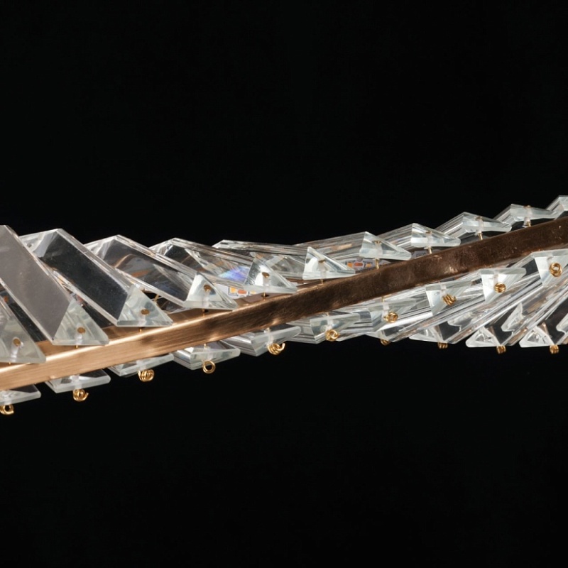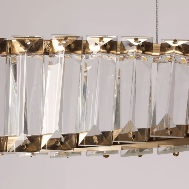 Металлическое основание подвесной люстры гальванизировано в цвет медовой латуни. Люстра декорирована прозрачным хрусталем.