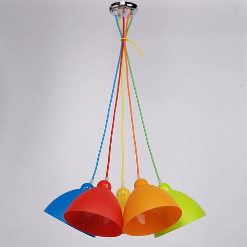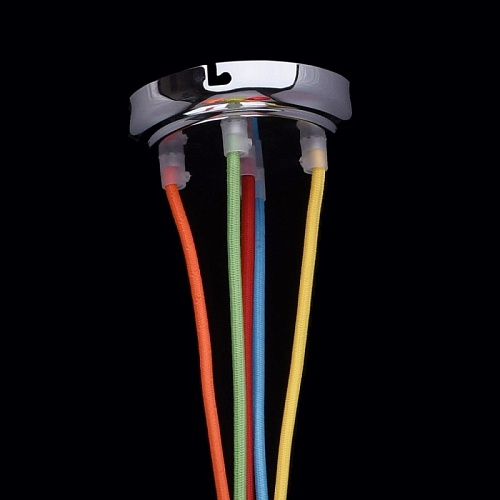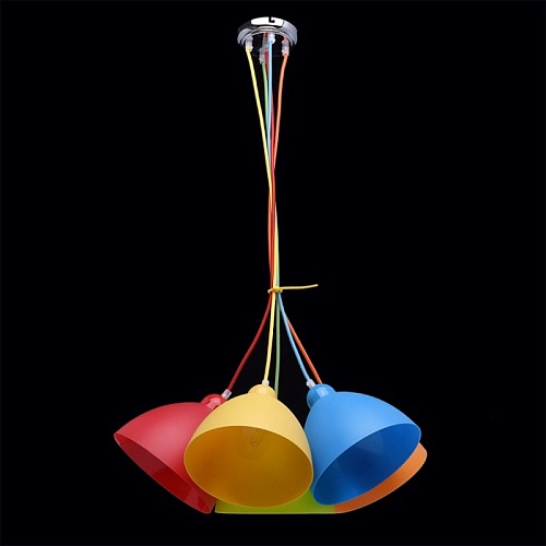 Основание светильника выполнено из сплава металла и гальванизировано в цвет хрома. Плафоны из разноцветного акрила крепятся на шнурах, аналогичных по цвету соответствующим плафонам.