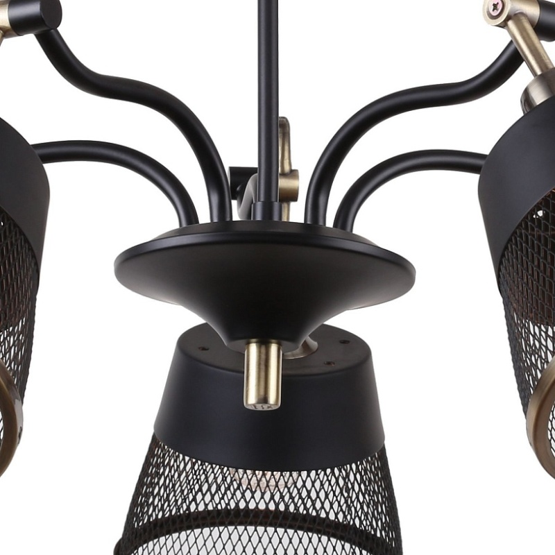Металлический каркас черного цвета с декоративными элементами в цвете латунь, плафоны из перфорированного металла черного цвета, регулируемая высота, сменные лампы.
