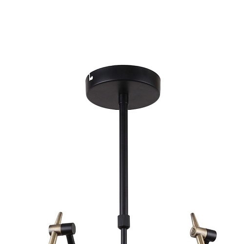 Металлический каркас черного цвета с декоративными элементами в цвете латунь, плафоны из перфорированного металла черного цвета, регулируемая высота, сменные лампы.