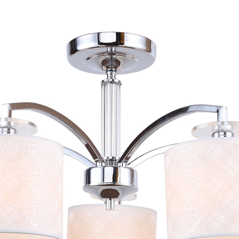 Хромированный металлический каркас, абажуры из белой узорной ткани, сменные лампы.