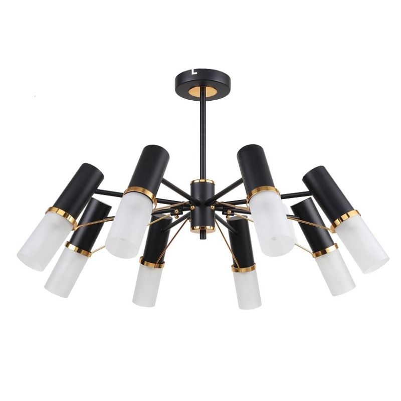 Металлический каркас черного цвета с декоративными элементами золотого цвета, плафоны из белого матового стекла.