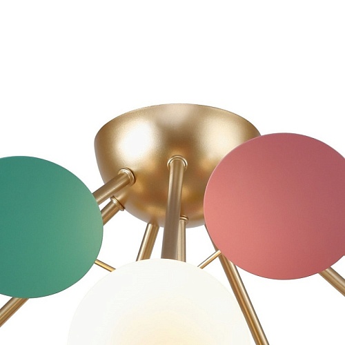 Металлический каркас золотого цвета, круглые стеклянные плафоны молочного цвета, декоративные круглые разноцветные пластины.