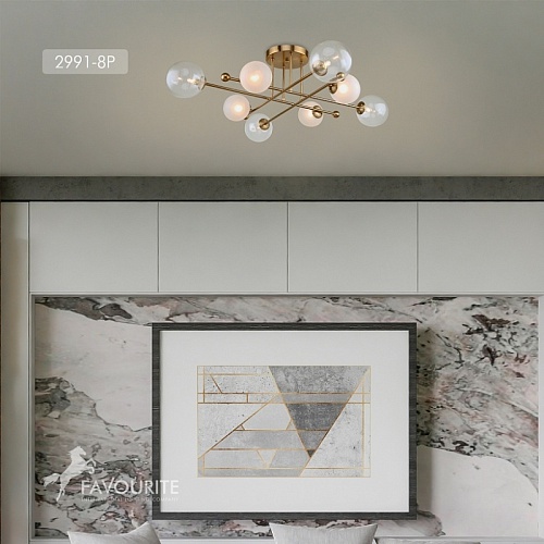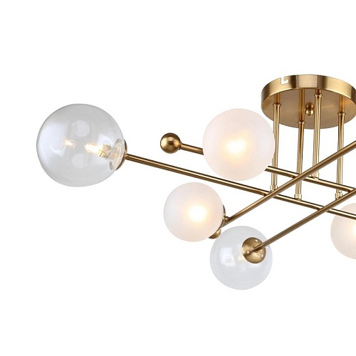 Металлический каркас цвета латунь, выдувные плафоны из белого и прозрачного стекла.