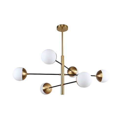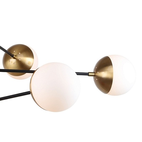 каркас двух цветов - матовый черный и латунь, плафоны из белого стекла, лампу G9 можно менять