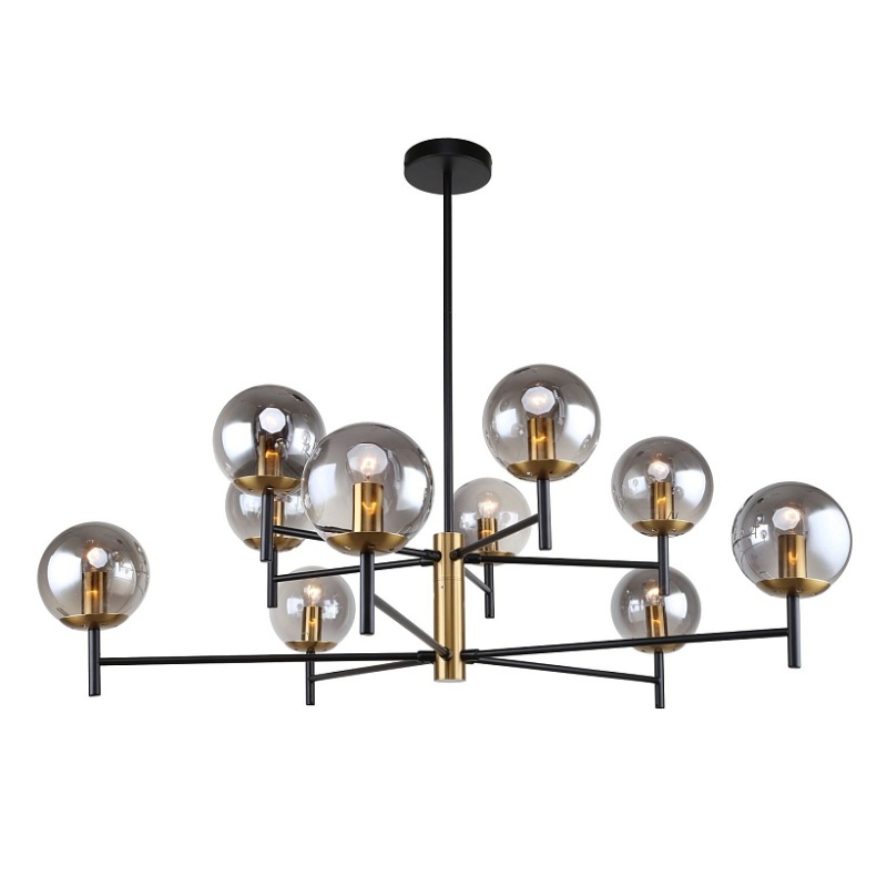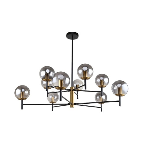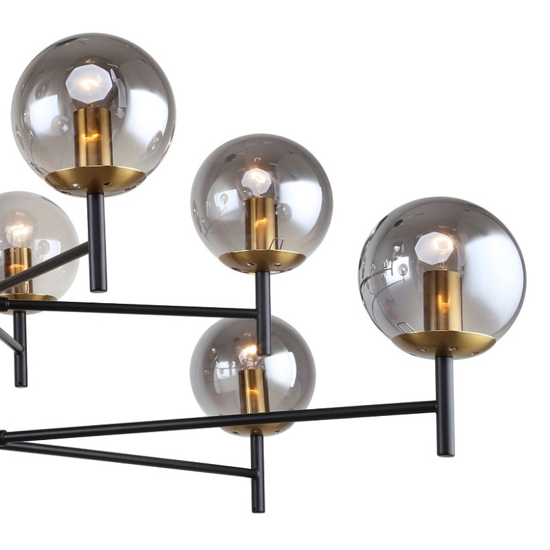 Металлический каркас черного цвета, круглые плафоны из стекла дымчатого серого цвета, декоративный элемент из металла цвета латунь, регулируемая высота.