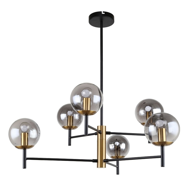 Металлический каркас черного цвета, круглые плафоны из стекла дымчатого серого цвета, декоративный элемент из металла цвета латунь, регулируемая высота.