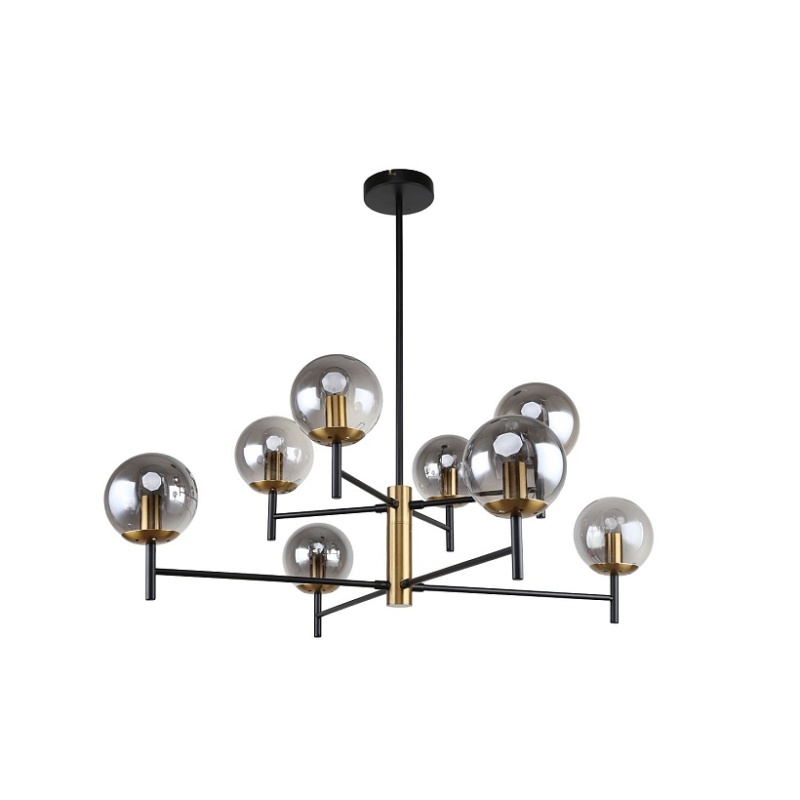 Металлический каркас черного цвета, круглые плафоны из стекла дымчатого серого цвета, декоративный элемент из металла цвета латунь, регулируемая высота.