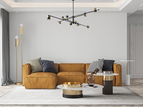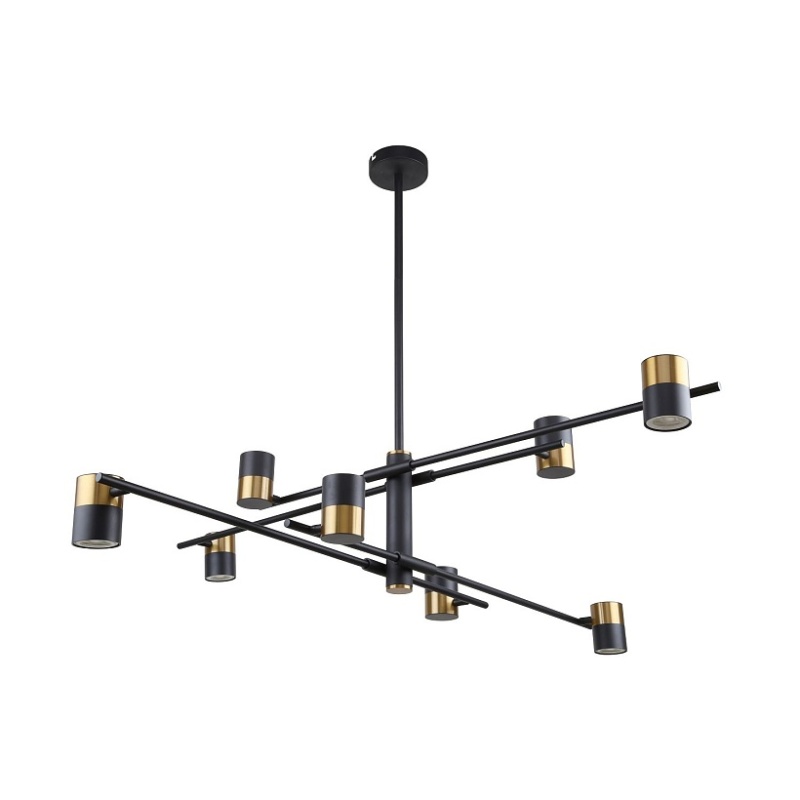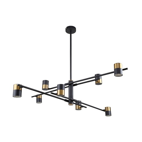 Металлический каркас матового черного цвета, поворотные плафоны с декоративными элементами цвета латуни, сменная лампа, регулируемая высота угол поворота до 360°.