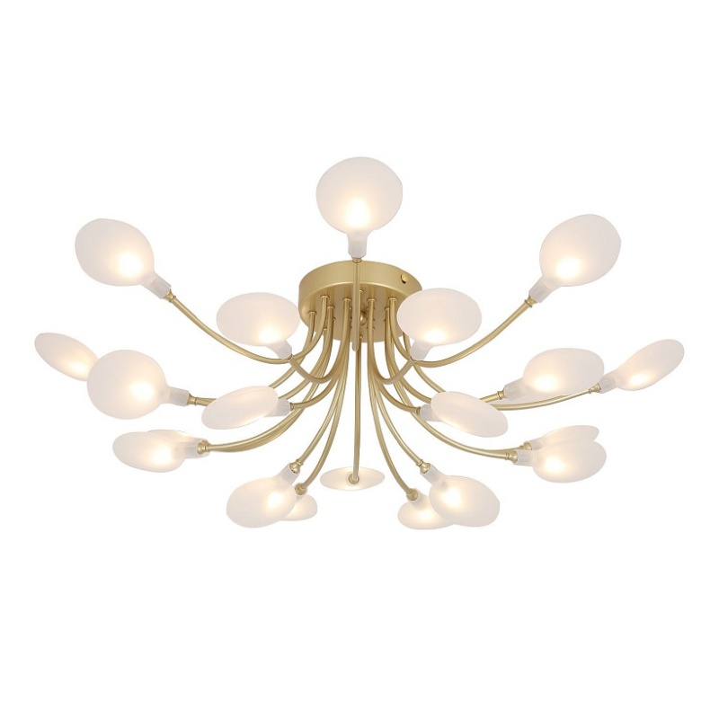 Металлический каркас в цвете золото, белые акриловые плафоны, сменные лампы.