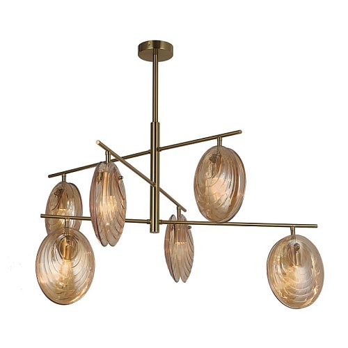 Металлический каркас в цвете латунь, плафоны состоят из двух узорных стеклянных пластин янтарного цвета, цоколь E14, регулируемая высота.