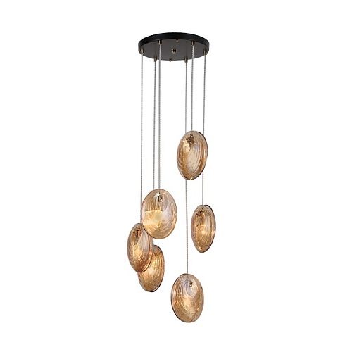 Металлический каркас в цвете латунь, плафоны состоят из двух узорных стеклянных пластин янтарного цвета, цоколь E14, регулируемая высота.