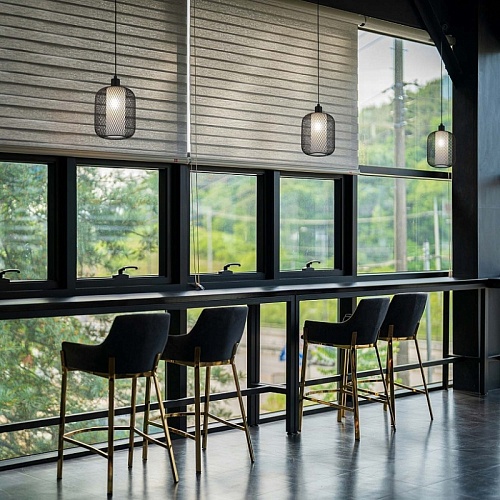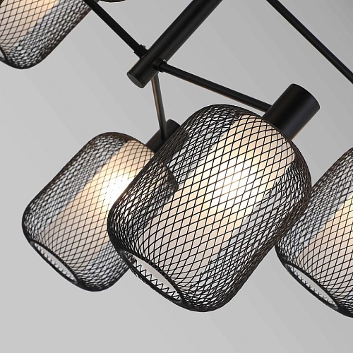 Каркас из металла черного матового цвета, двойные абажуры из металлической сетки и стекла, цоколь E14.