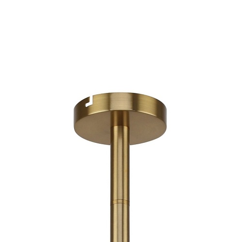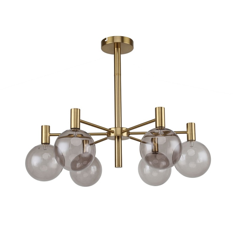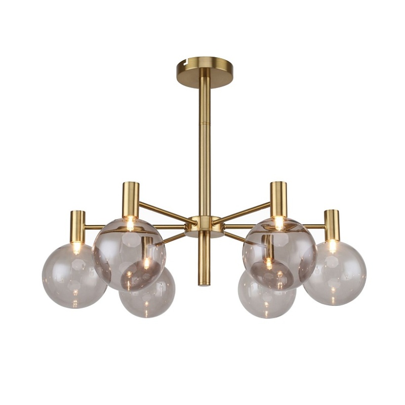 Металлический каркас цвета латунь, круглые плафоны из стекла коньячного оттенка.