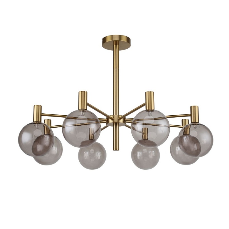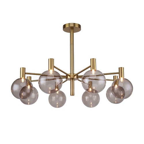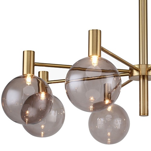 Металлический каркас цвета латунь, круглые плафоны из стекла коньячного оттенка.