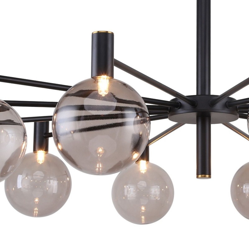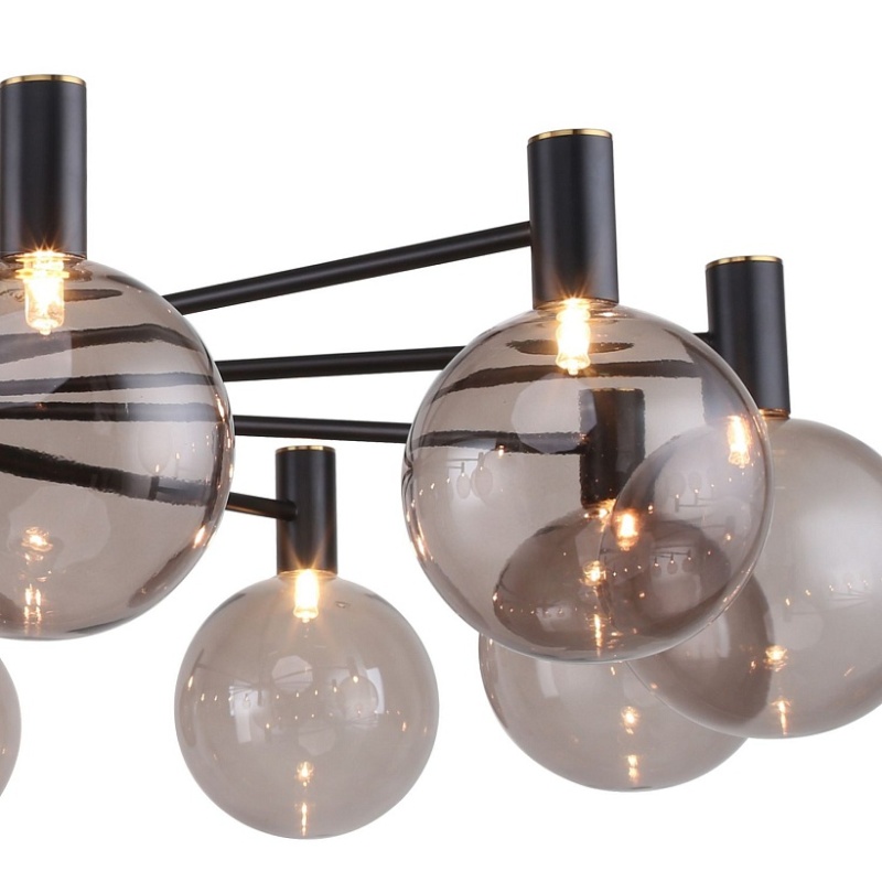 Металлический каркас черного цвета, с тонкими полосками цвета латуни, которые находятся в середине Металлический каркаса, в конце и в основании плафонов, выдувные плафоны серого цвета.