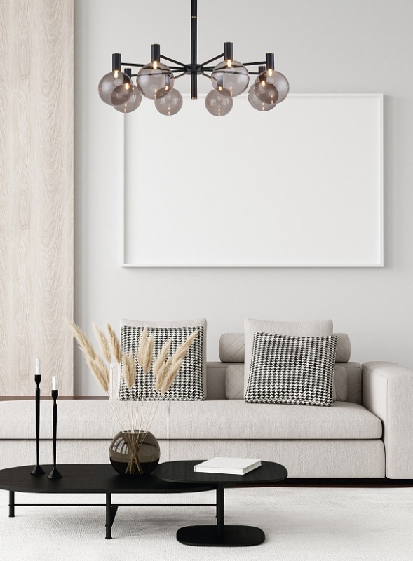 Металлический каркас черного цвета, с тонкими полосками цвета латуни, которые находятся в середине Металлический каркаса, в конце и в основании плафонов, выдувные плафоны серого цвета.