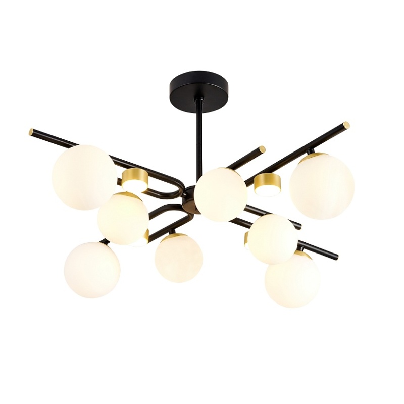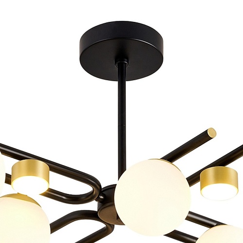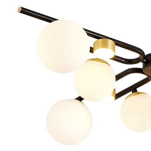 каркас черного матового цвета, декоративные элементы из золота, плафоны двух видов из белого матового стекла и металла цвета золота, лампу G9 можно ме