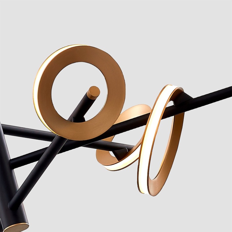 Металлический каркас черного цвета, объемные кольца цвета матовое золото, закреплены под разным углом к каркасу светильника, светятся по периметру благодаря встроенной ленте LED, регулируемая высота.