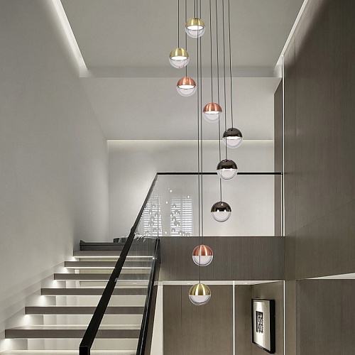 Каскадная люстра с черным каркасом, с шарообразными плафонами трех цветов (черный глянцевый, золото, розовое золото), разделенными на две части — металлическую и акриловую, в центре плафона расположен LED-модуль, создающий оригинальный световой эффект, регулируемая высота.
