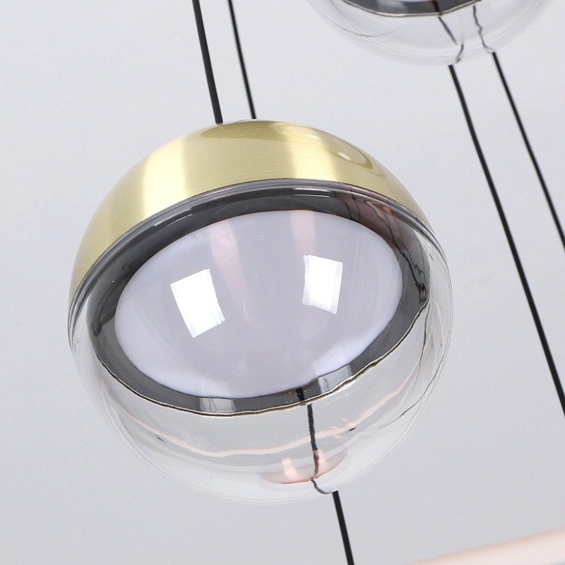 Каскадная люстра с черным каркасом, с шарообразными плафонами трех цветов (черный глянцевый, золото, розовое золото), разделенными на две части — металлическую и акриловую, в центре плафона расположен LED-модуль, создающий оригинальный световой эффект, регулируемая высота.