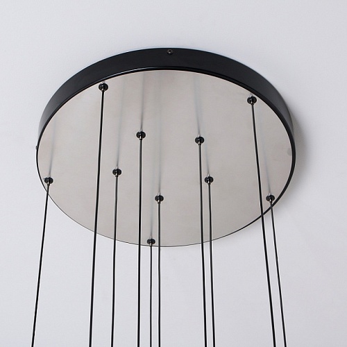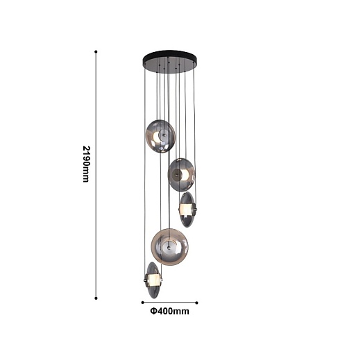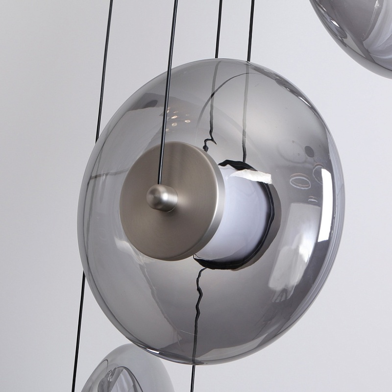 Металлический каркас черного матового цвета, вертикальное крепление плоского сферического выдувного плафона из дымчато-серого стекла, по периметру сердцевины плафона расположен модуль LED.