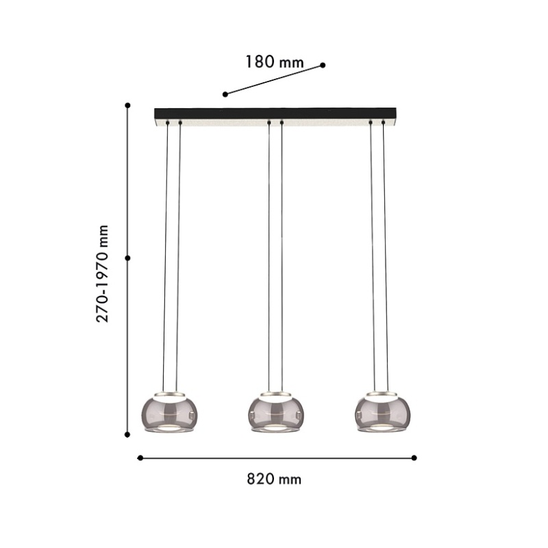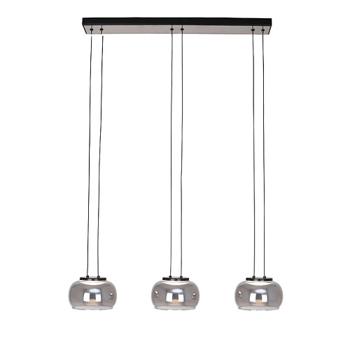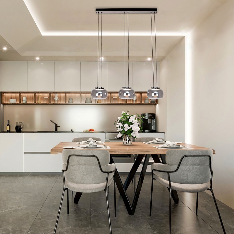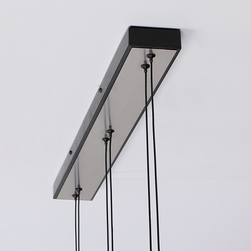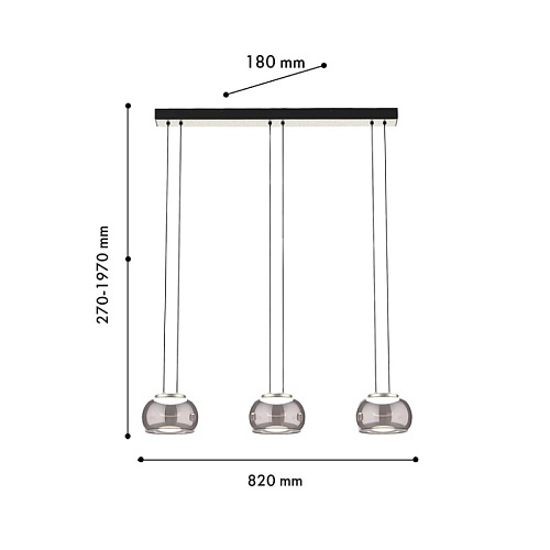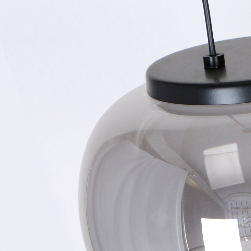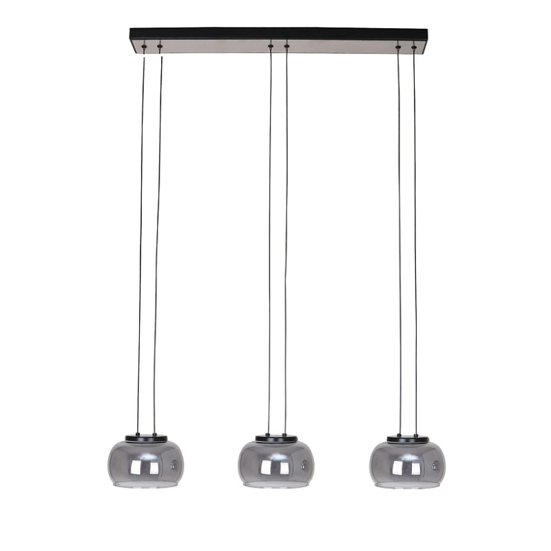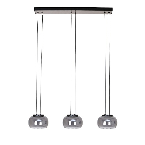 Потолочная люстра с черным каркасом и декором в цвете никель, плафоны из выдувного стекла дымчато-серого цвета, встроенный модуль LED, регулируемая высота.