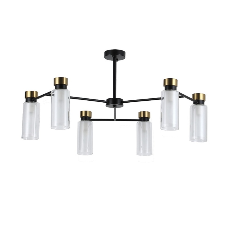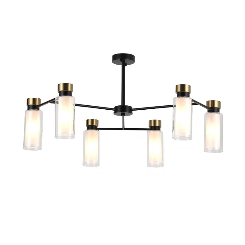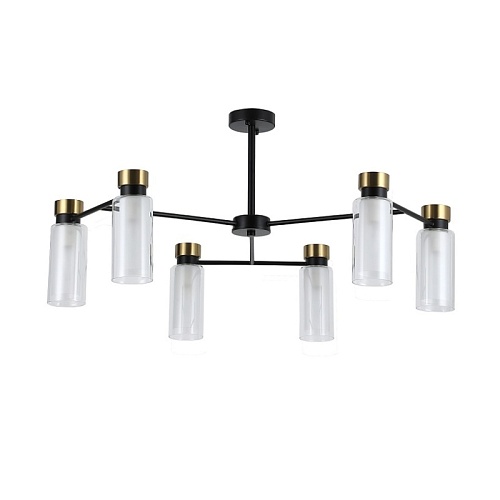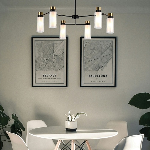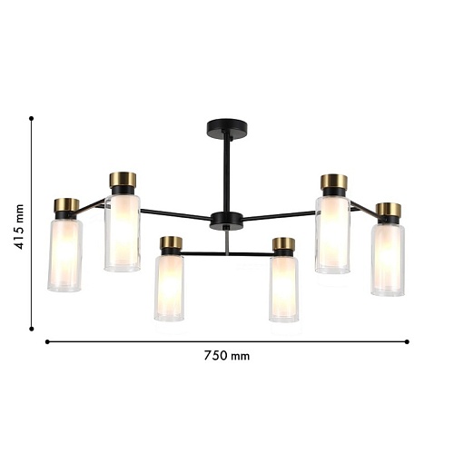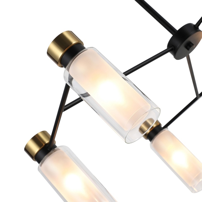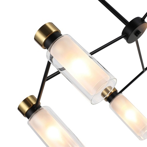 Металлический каркас черного матового цвета, цилиндрические плафоны, состоящие из двух слоев: внутренний из белого матового стекла, внешний - из прозрачного стекла, декоративные элементы в цвете латунь, цоколь E14.