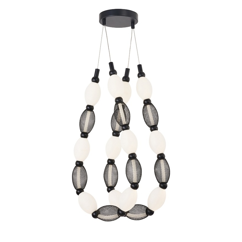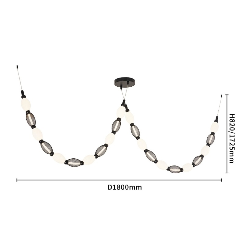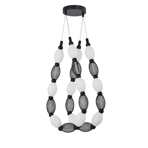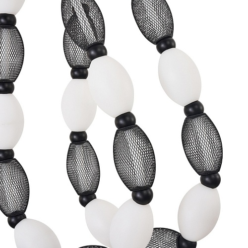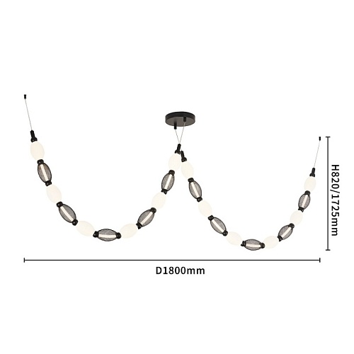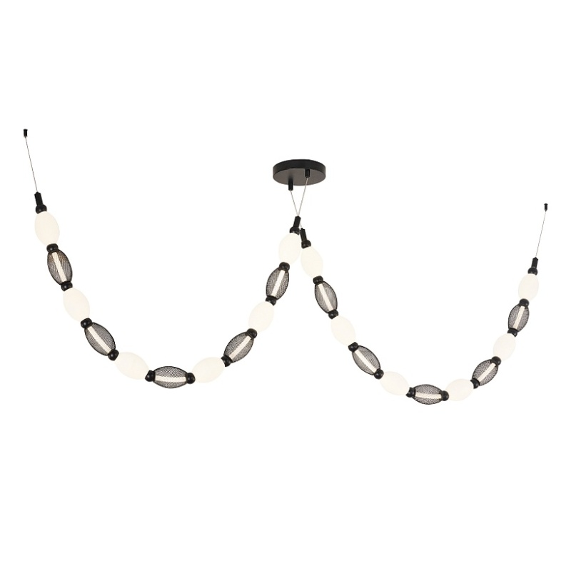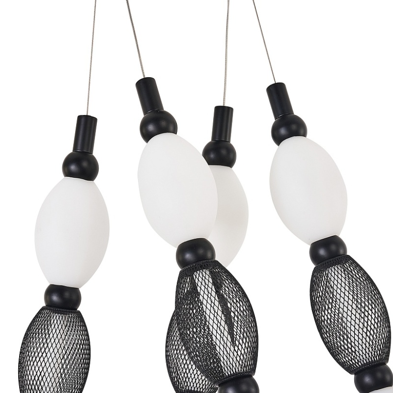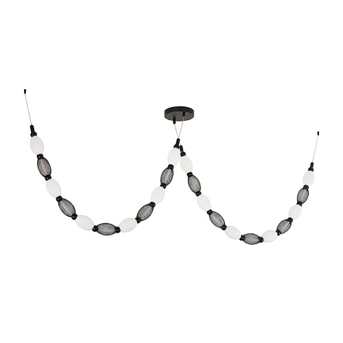 Металлический каркас черного цвета, гибкая силиконовая трубка со встроенной лентой LED и нанизанными плафонами из белого акрила и декоративной металлической сетки. Варианты крепления: на потолок, стены, включая вариант с фиксацией от потолка до пола.