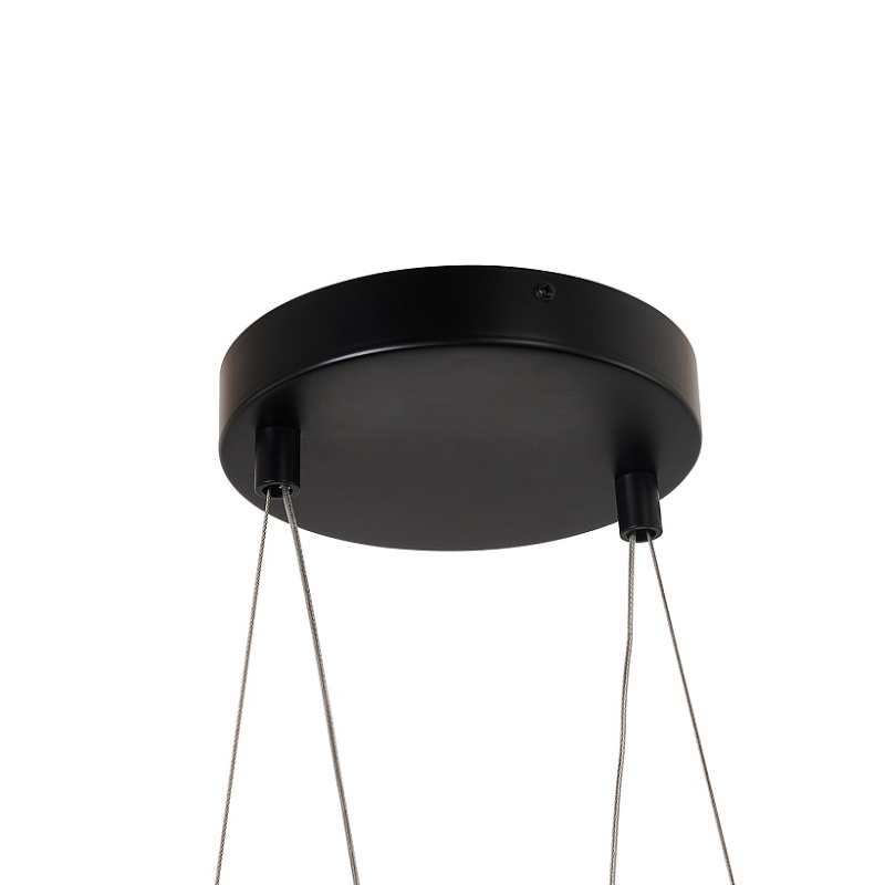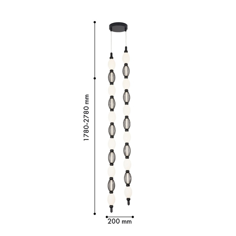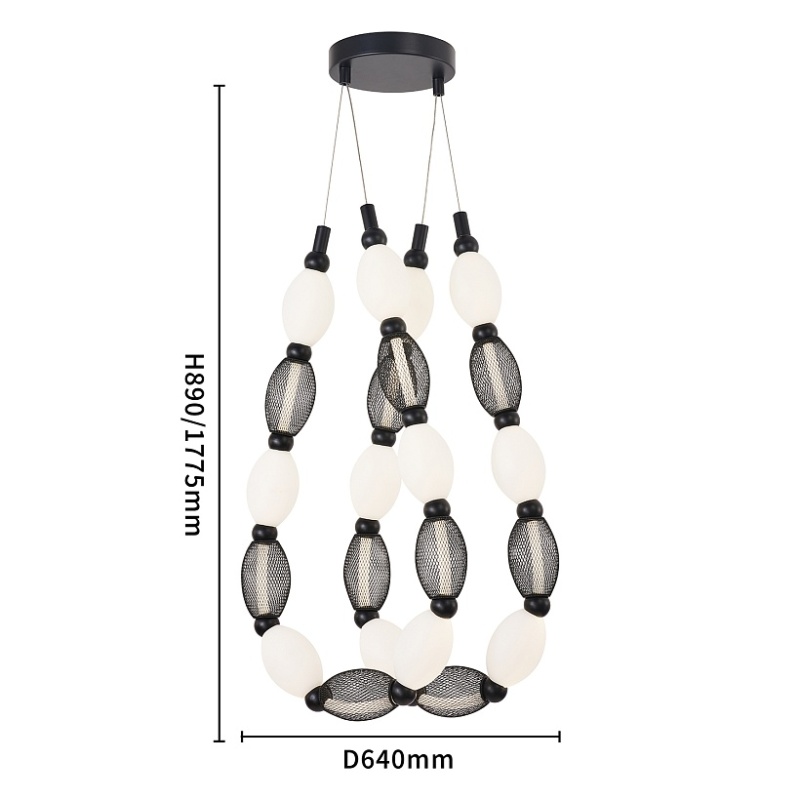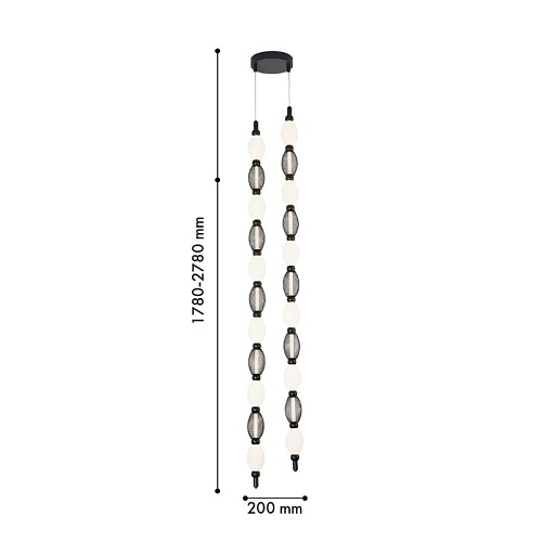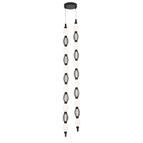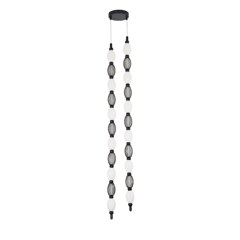 Металлический каркас черного цвета, гибкая силиконовая трубка со встроенной лентой LED и нанизанными плафонами из белого акрила и декоративной металлической сетки. Варианты крепления: на потолок, стены, включая вариант с фиксацией от потолка до пола.