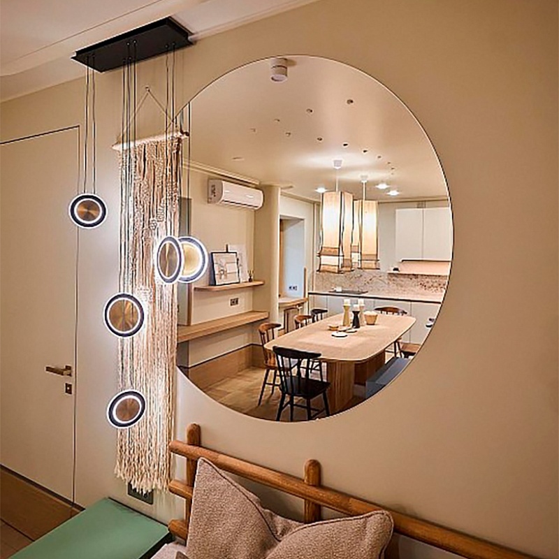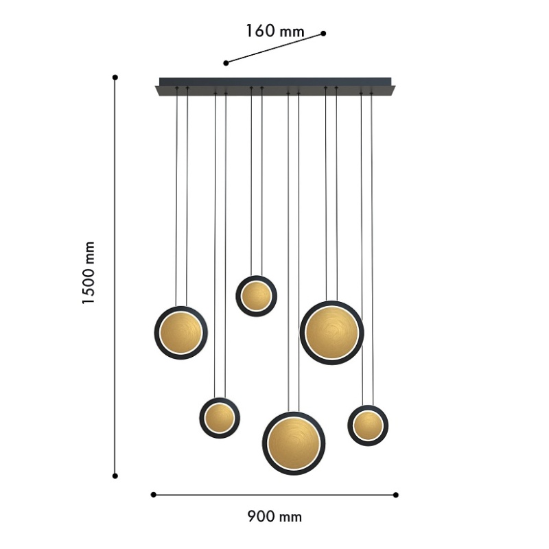 Потолочная люстра с каркасом в черном цвете, с 6 плафонами в форме дисков различных размеров в цвете латуни с черным кантом. Каждый диск оснащен тремя встроенными лентами LED, подвешен на двух параллельных струнах и имеет регулируемую высоту.