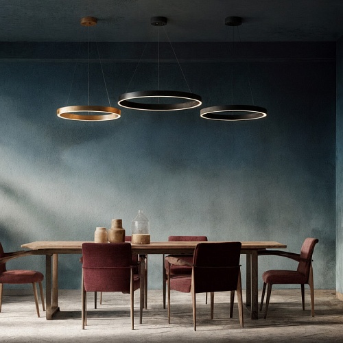 RAYDIA — коллекция подвесных светильников с уникальным кольцевым дизайном, создающих мягкое равномерное освещение в двух направлениях: вверх и вниз. Элегантный дизайн делает их стильным акцентом в любом пространстве. Металлический корпус с акриловым рассеивателем. CRI ? 80 для естественного восприятия оттенков. Регулировка цветовой температуры 3000К–4000К. Угол рассеивания 120° для комфортного общего света. Доступны два размера: 600 и 800 мм. Цветовые решения: черный и матовое золото.Идеально для гостиных, обеденных зон, переговорных и общественных пространств. Коллекция сочетает в себе функциональность и декоративность, создавая гармоничное освещение и подчёркивая архитектурные особенности интерьера. Срок гарантии 3 года.