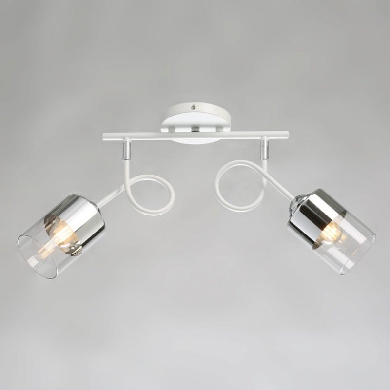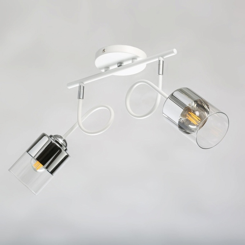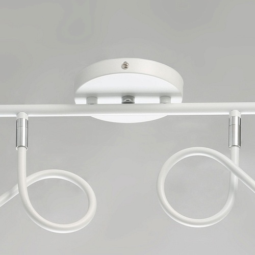 Металлическое основание потолочного светильника окрашено в белый цвет. Отдельные элементы гальванизированы в цвет хрома. Стеклянные плафоны частично гальванизированы в цвет хрома