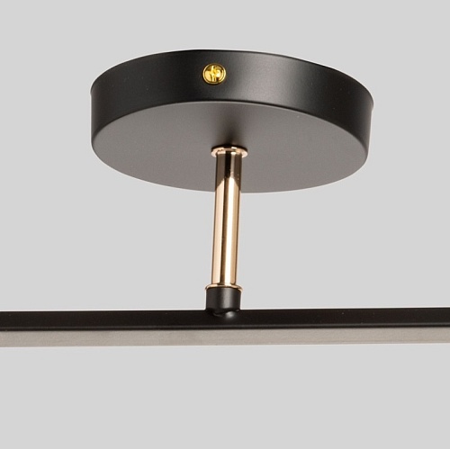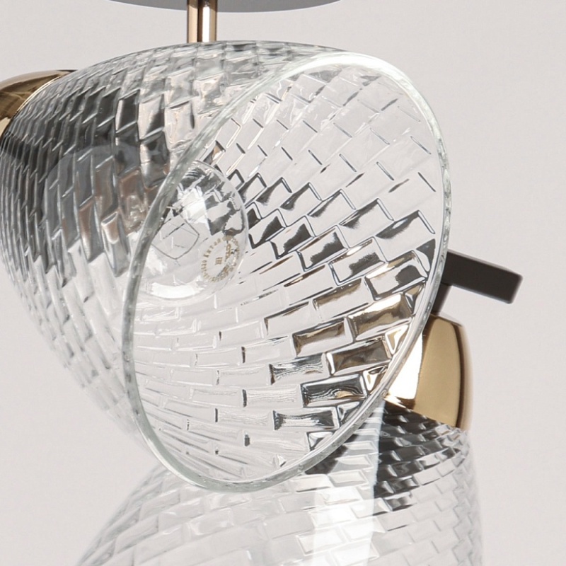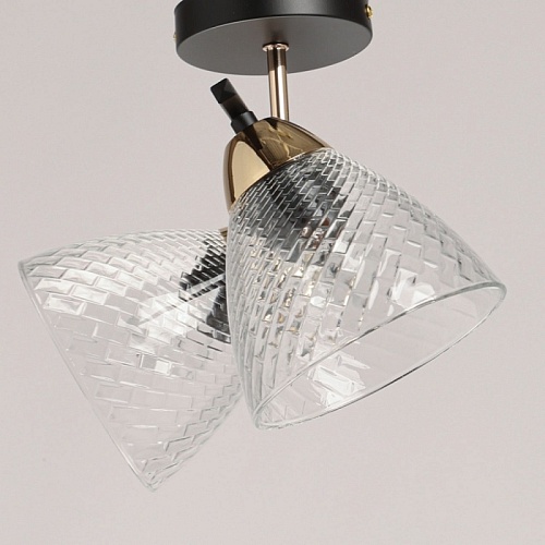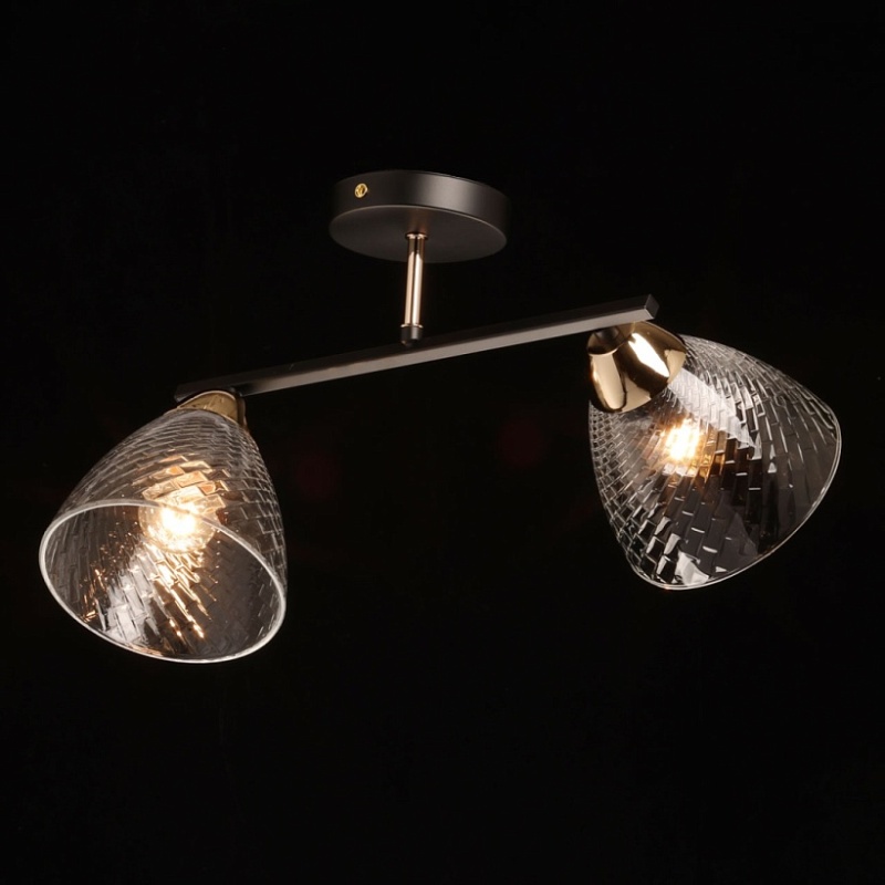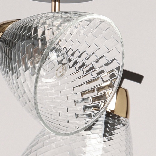Металлическое основание потолочной люстры окрашено в черный цвет. Отдельные элементы основания гальванизированы в цвет золота. Потолочный светильник декорирован плафонами из прозрачного фактурного стекла.