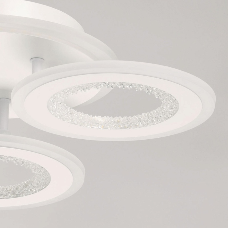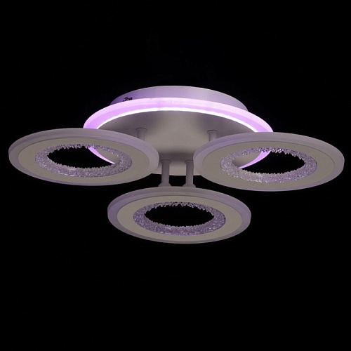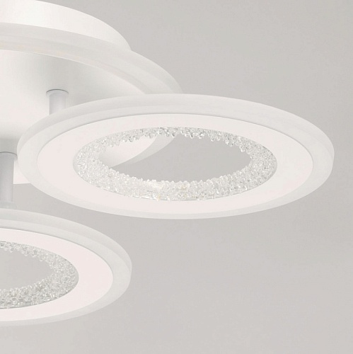 Металлическое основание потолочной люстры окрашено в белый цвет. Корпус плафона выполнен из сплава алюминия с цинком и окрашен в цвет основания. Светодиодные источники света закрыты белым матовым акрилом. Плафоны декорированы прозрачным фактурным акрилом. Дополнительно, в светильнике предусмотрена подсветка потолочной чаши. Светильник приходит в состоянии частичной сборки в компактной упаковке: вся электрика подсоединена, достаточно закрепить плафоны на корпусе.