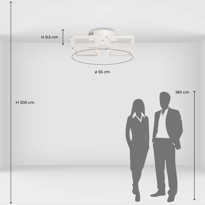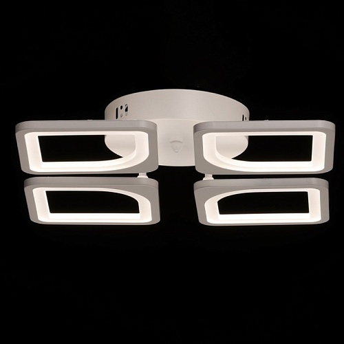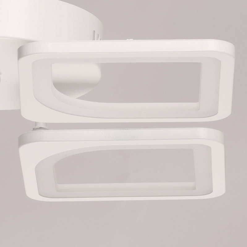 Металлическое основание потолочной люстры окрашено в белый цвет. Корпус плафона выполнен из сплава алюминия с цинком и окрашен в цвет основания. Светодиодные источники света закрыты белым матовым акрилом. Светильник приходит в состоянии частичной сборки в компактной упаковке: вся электрика подсоединена, достаточно закрепить плафоны на корпусе.