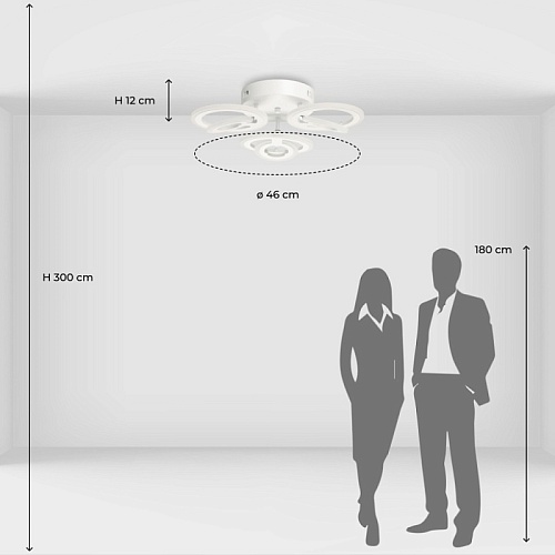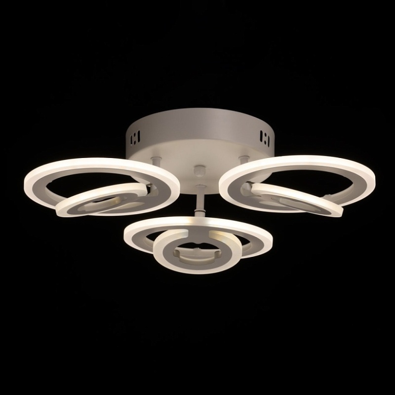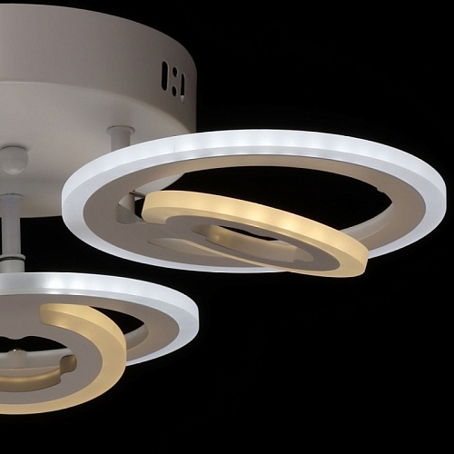 Металлическое основание потолочной люстры окрашено в белый цвет. Корпус плафона выполнен из сплава алюминия с цинком и окрашен в цвет основания. Светодиодные источники света закрыты белым матовым акрилом. Светильник приходит в состоянии частичной сборки в компактной упаковке: вся электрика подсоединена, достаточно закрепить плафоны на корпусе.