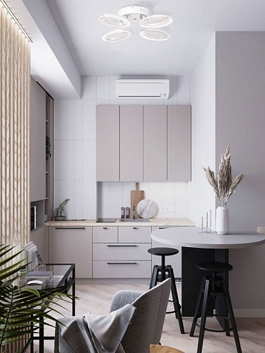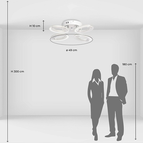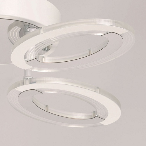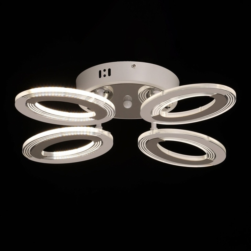 Металлическое основание потолочной люстры окрашено в белый цвет. Потолочная чаша закрыта листом нержавеющей стали, отполированной до зеркального блеска. Корпус плафона выполнен из сплава алюминия с цинком и окрашен в цвет основания. Светодиодные источники света закрыты белым матовым и прозрачным акрилом.