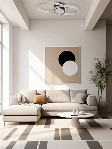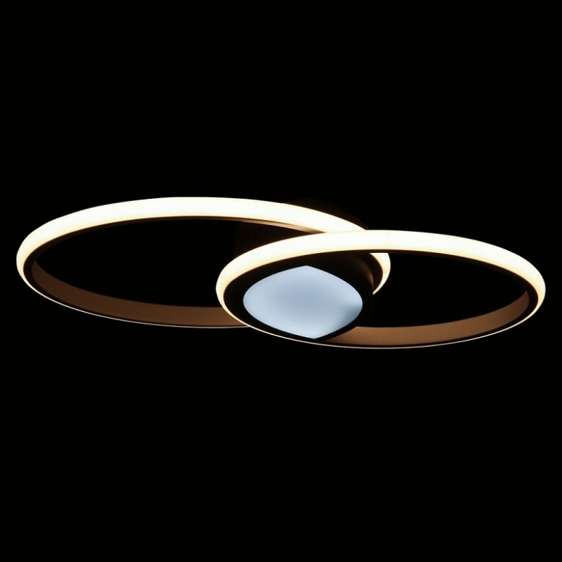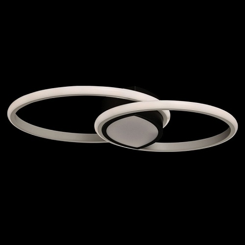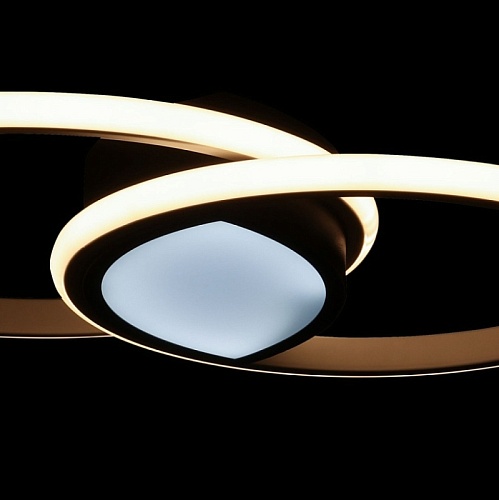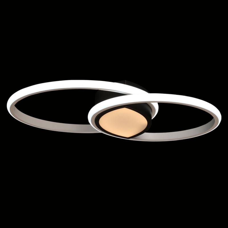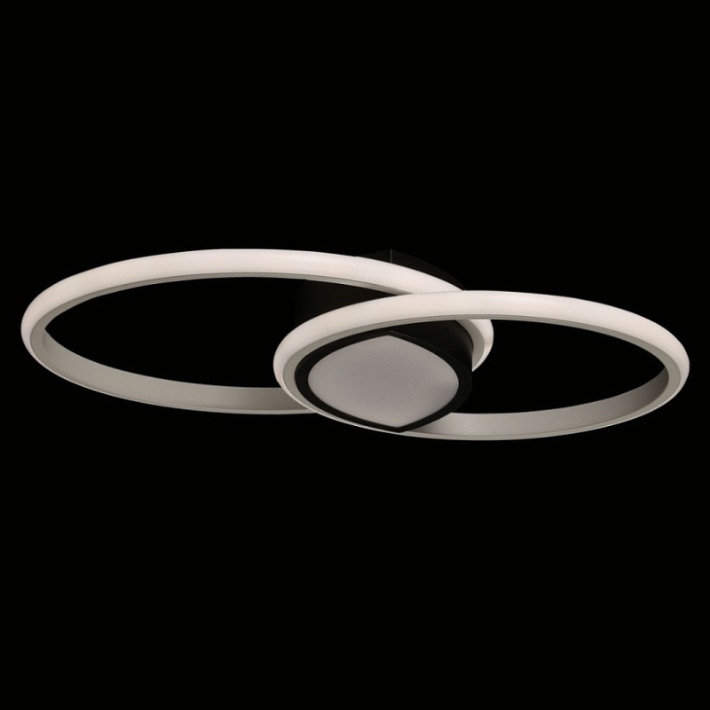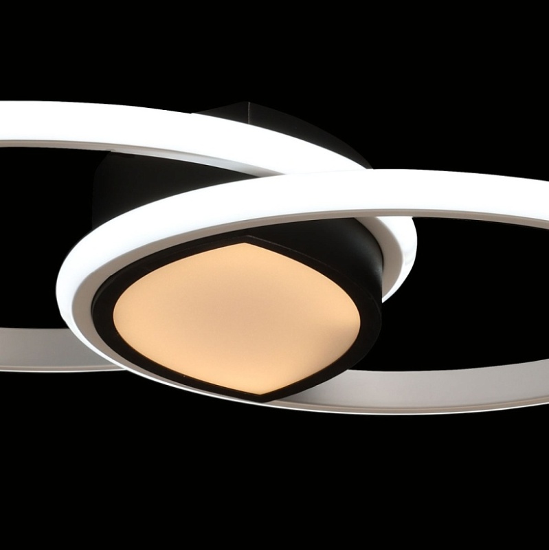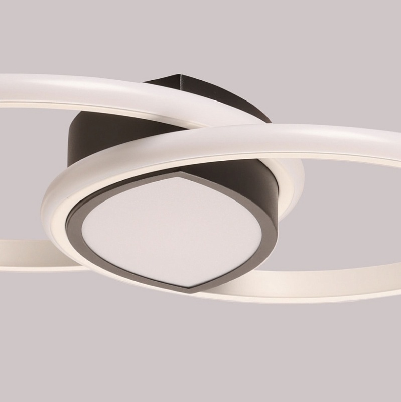Металлическое основание потолочной люстры окрашено в черный цвет. Корпус плафонов выполнен из сплава алюминия с цинком и окрашен в белый и черный цвета. Светодиодные источники света закрыты белым матовым силиконом. Люстра в центре декорирована белым акрилом.