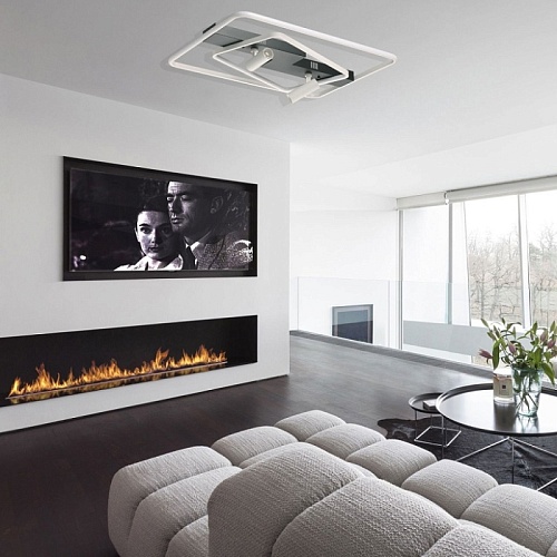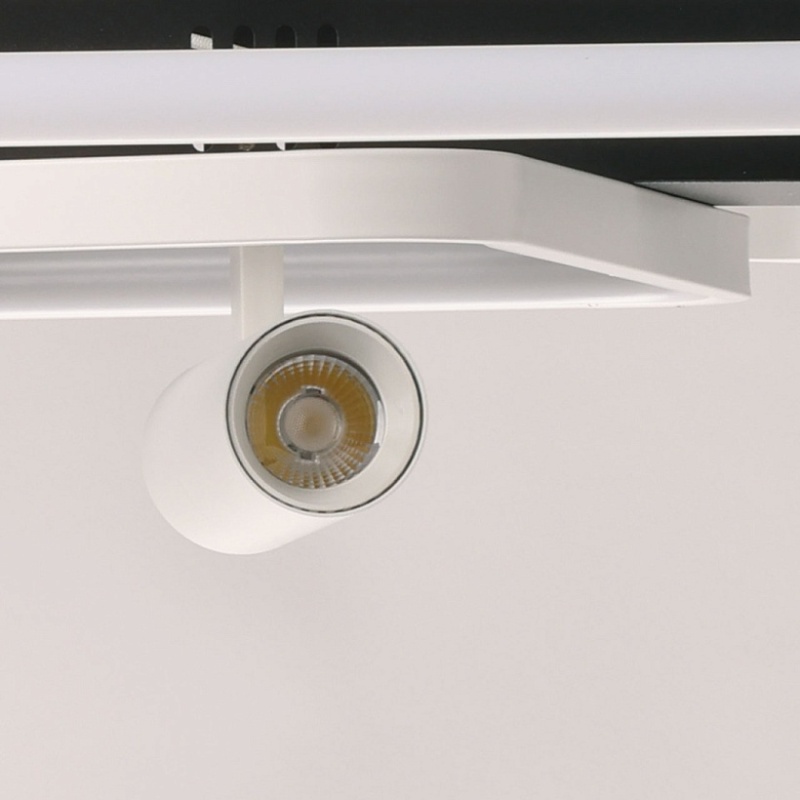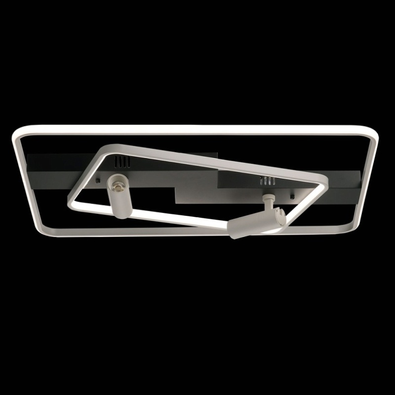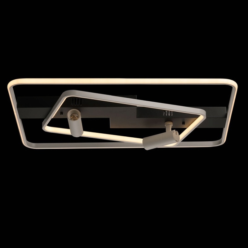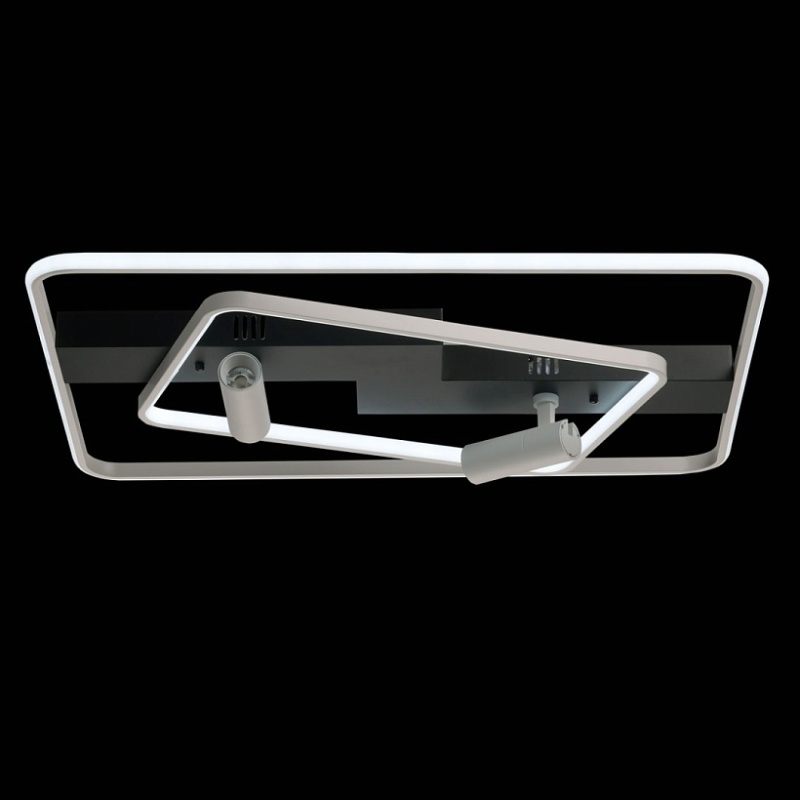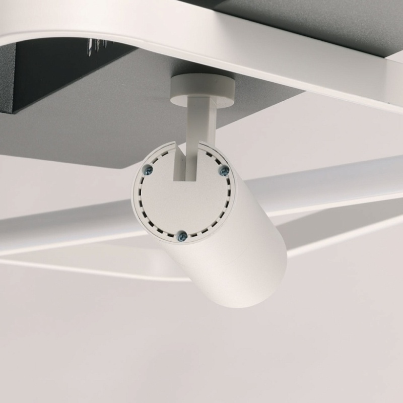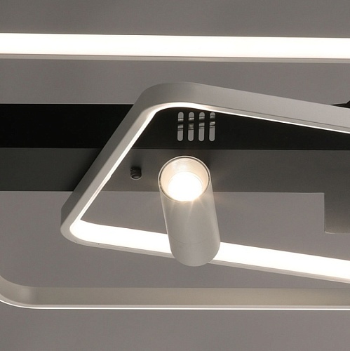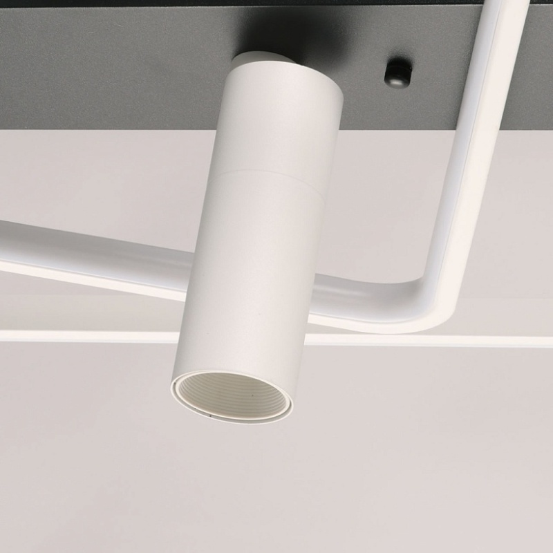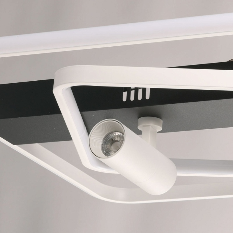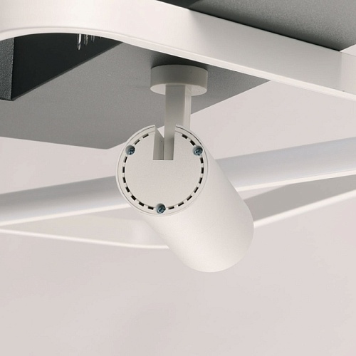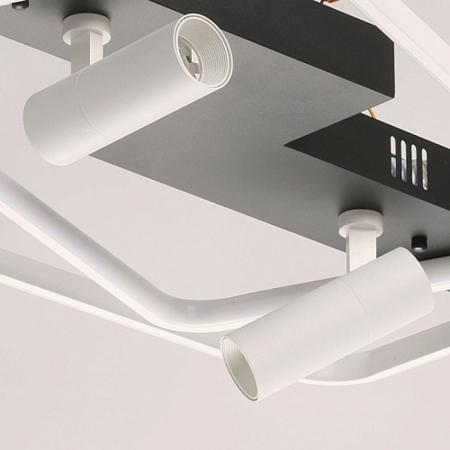 Металлическое основание потолочной люстры окрашено в черный цвет. Корпус прямоугольных плафонов выполнен из сплава алюминия с цинком и окрашен в белый цвет. Светодиодные источники света на этих плафонах закрыты силиконом белого цвета. Плафоны спотов также выполнены из сплава алюминия с цинком и окрашены в белый цвет. Плафоны крепятся на поворотных шарнирах.
