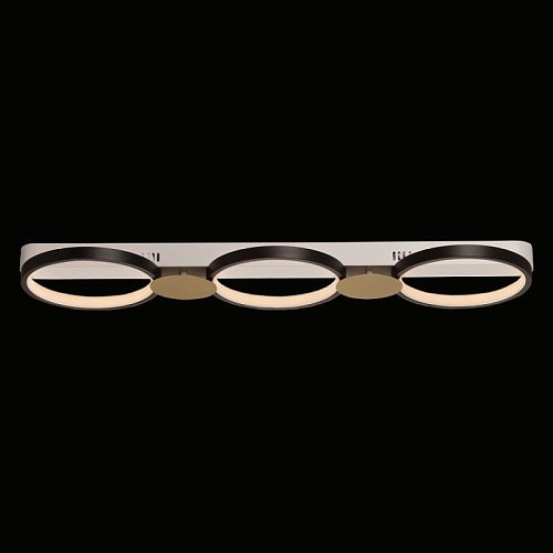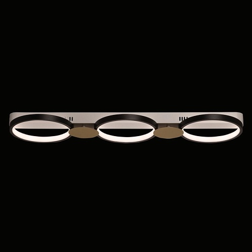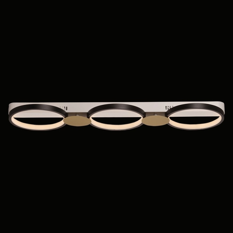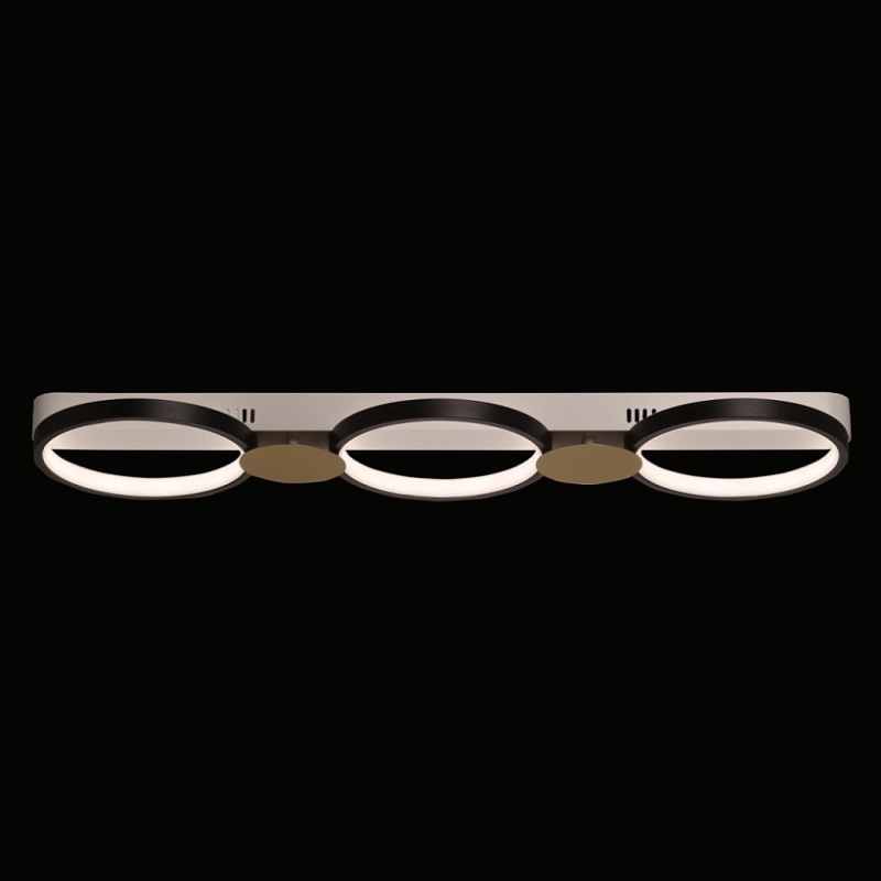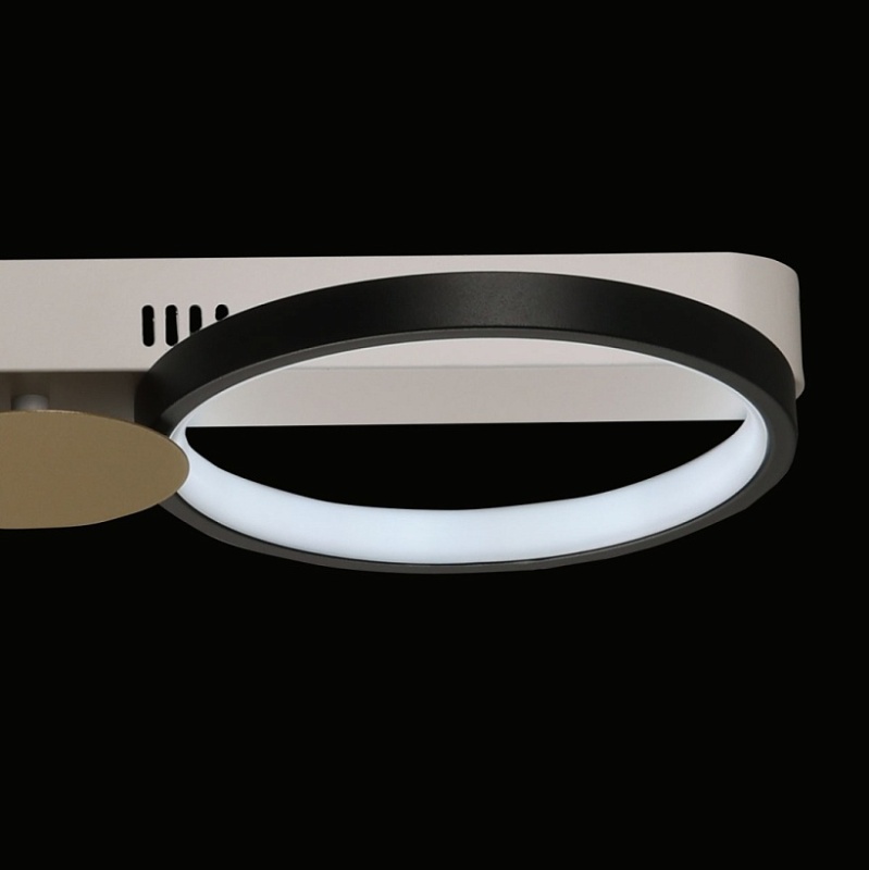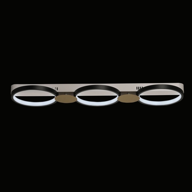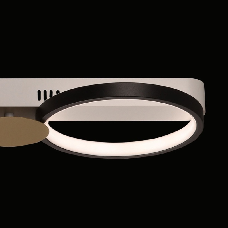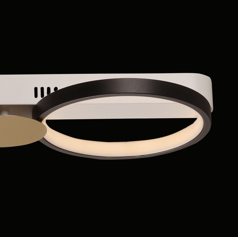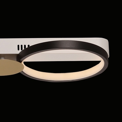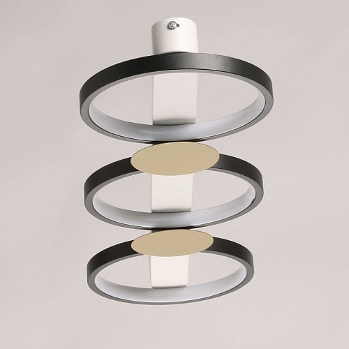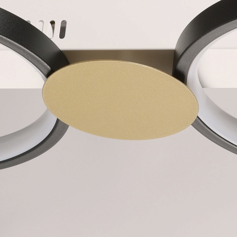 Металлическое основание потолочной люстры окрашено в белый цвет. Корпус плафонов выполнен из сплава алюминия с цинком и окрашен в черный цвет. Светодиодные источники света закрыты силиконом белого цвета. Люстра декорирована металлическими пластинами, окрашенными в цвет матового золота.