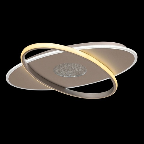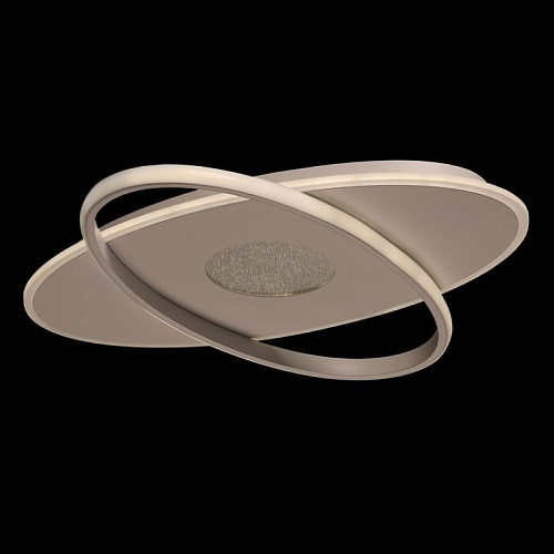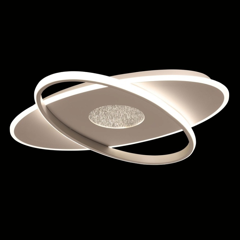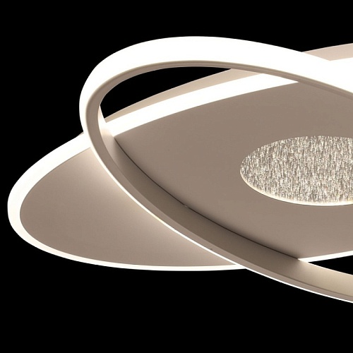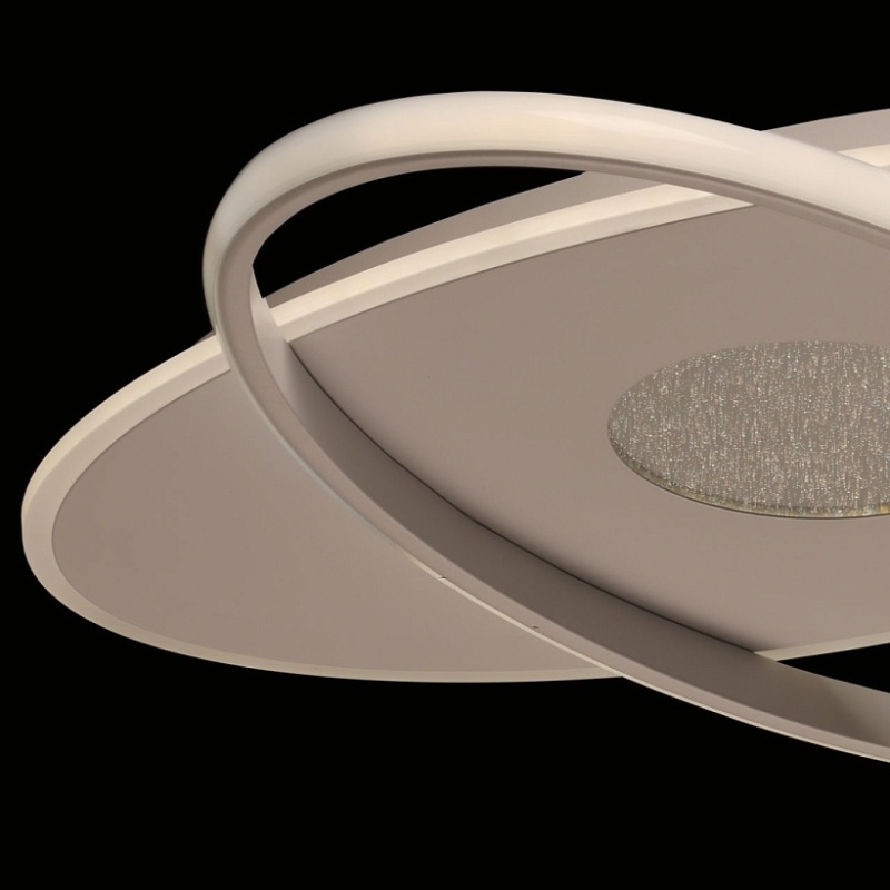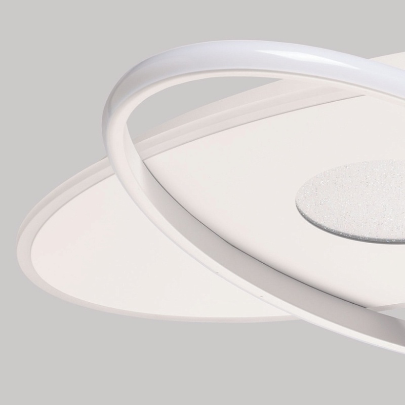 Металлическое основание потолочной люстры окрашено в белый цвет. Светодиодные источники света на основании закрыты матовым акрилом, на плафоне - силиконом белого цвета.
