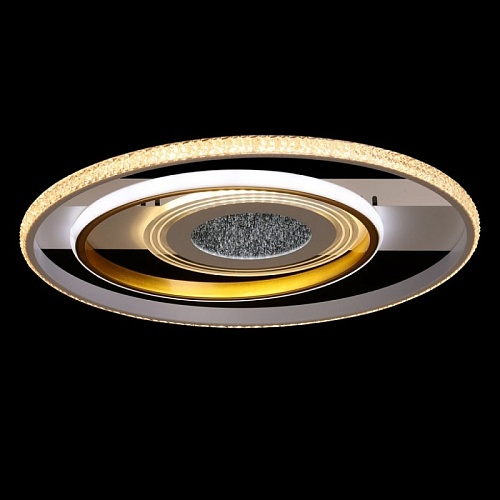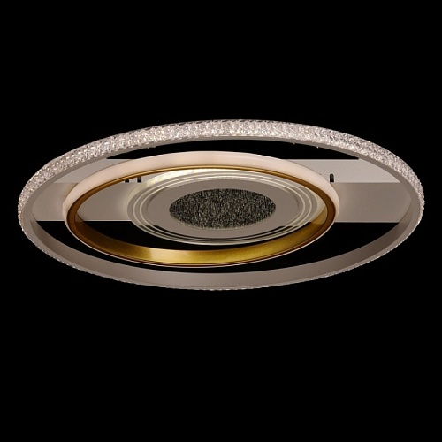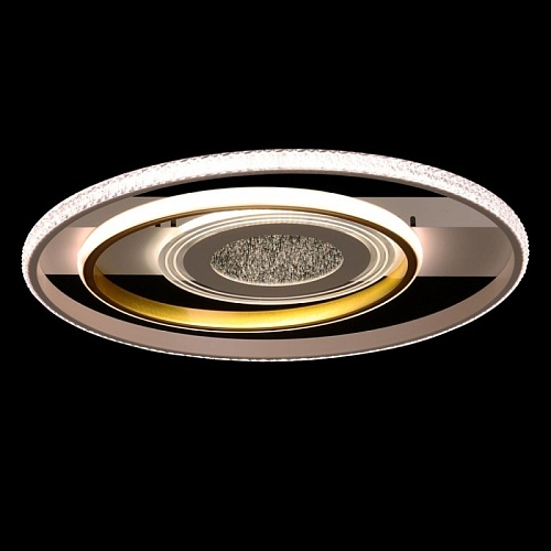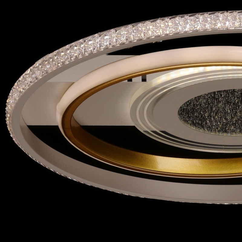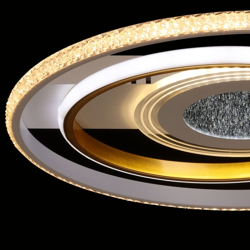Металлическое основание потолочной люстры окрашено в белый цвет. Корпус плафонов выполнен из сплава алюминия с цинком и окрашен в золотой и белый цвета. Светодиодные источники света закрыты прозрачным и белым матовым акрилом. В центре потолочная люстра декорирована прозрачным акрилом круглой формы и акрилом в виде хрустальной россыпи.