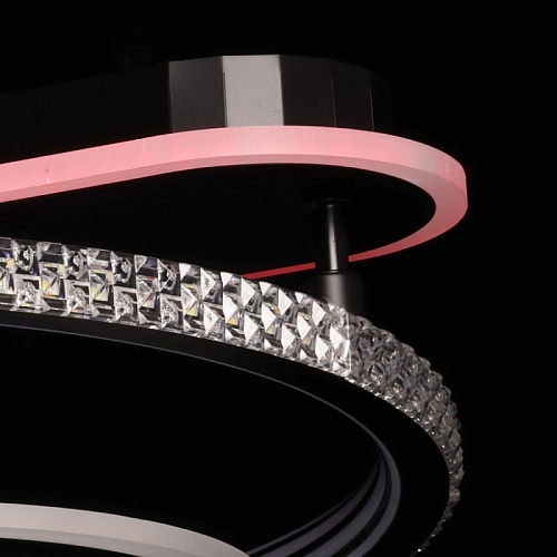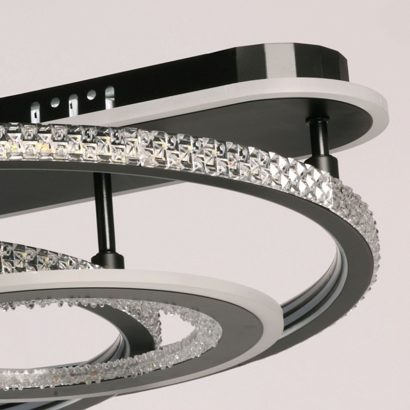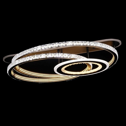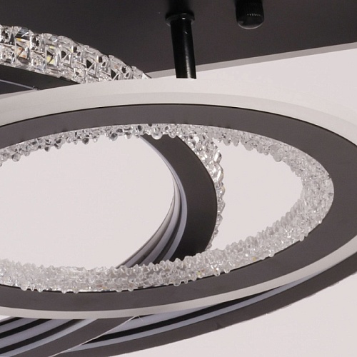 Металлическое основание потолочной люстры окрашено в черный цвет. Корпус плафонов выполнен из сплава алюминия с цинком и окрашен в цвет основания. Светодиодные источники света закрыты прозрачным фактурным или матовым акрилом.