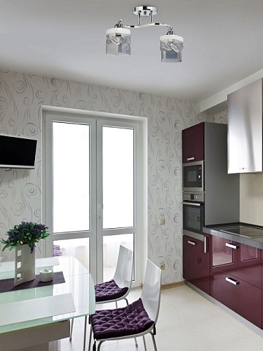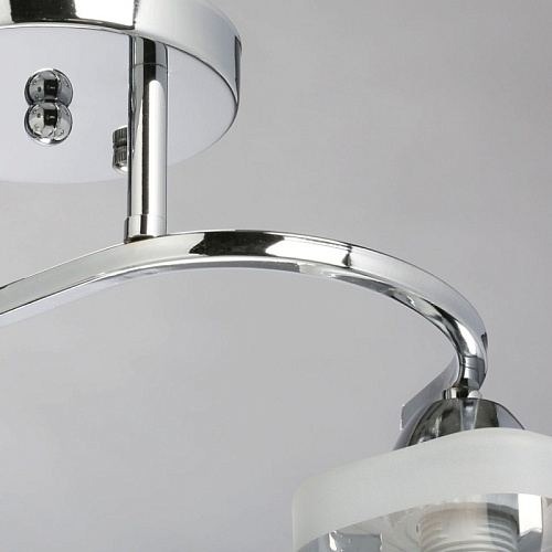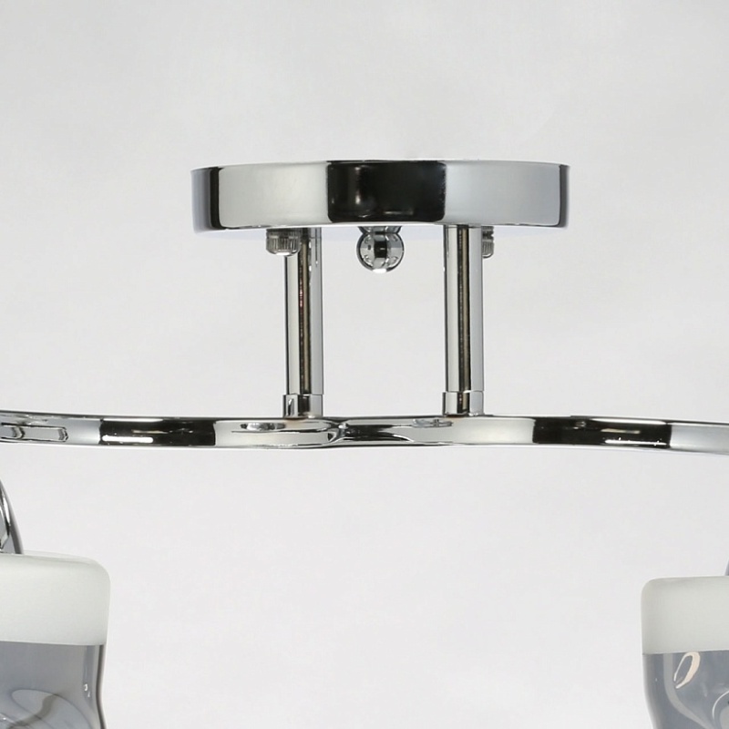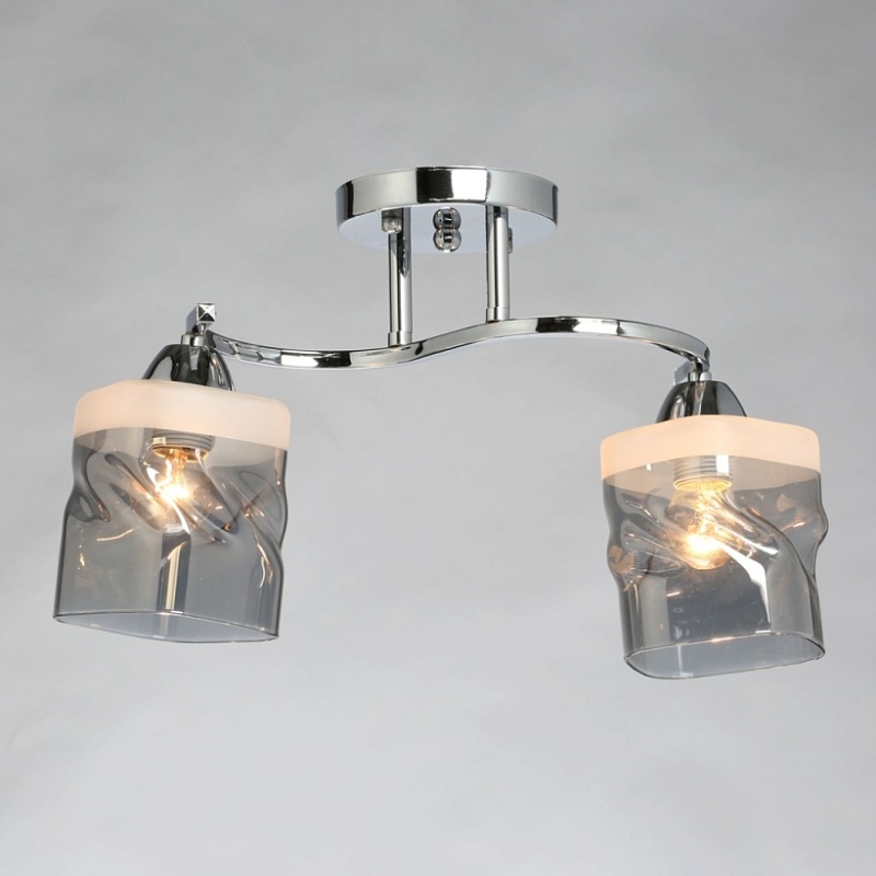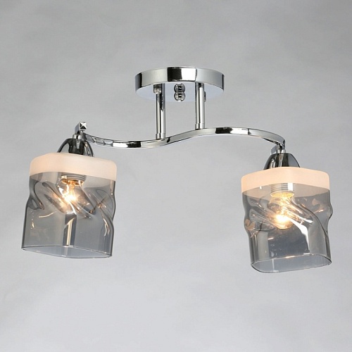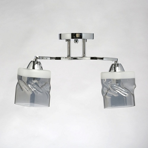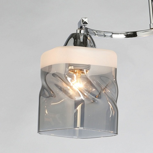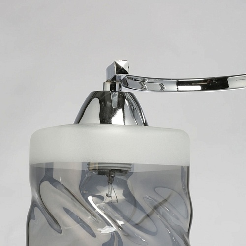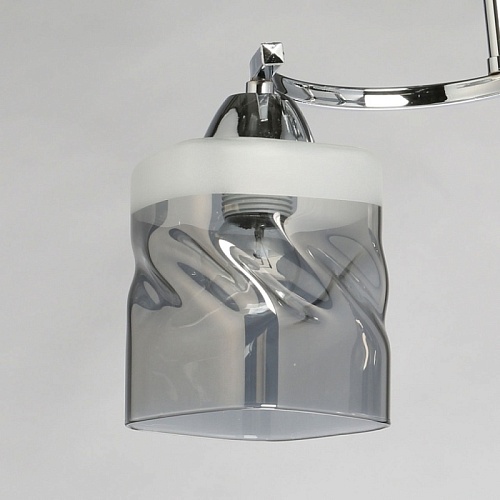 Металлическое основание светильника гальванизировано в цвет хрома. Стеклянные плафоны отлиты в сложную перекрученную форму и гальванизированы в дымчатый цвет. У основания плафоны окрашены в белый цвет.