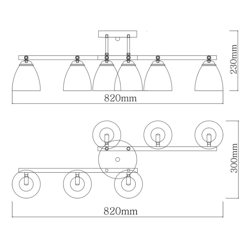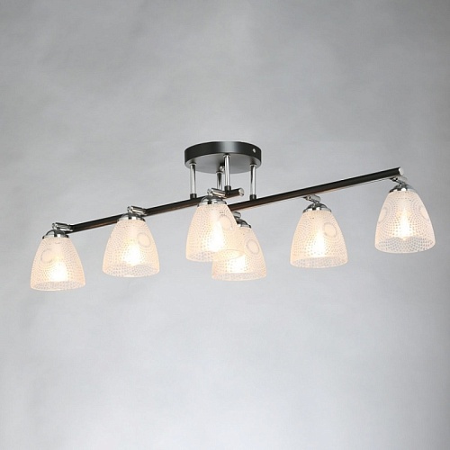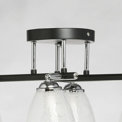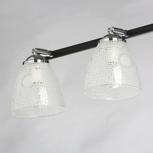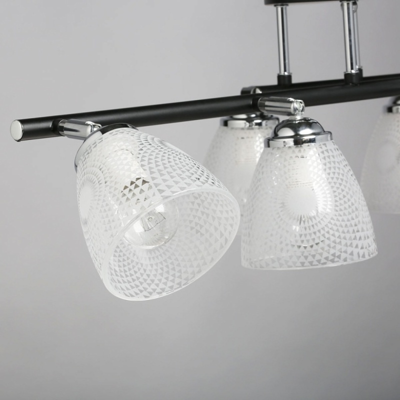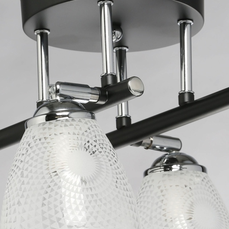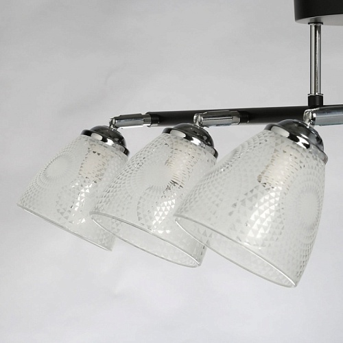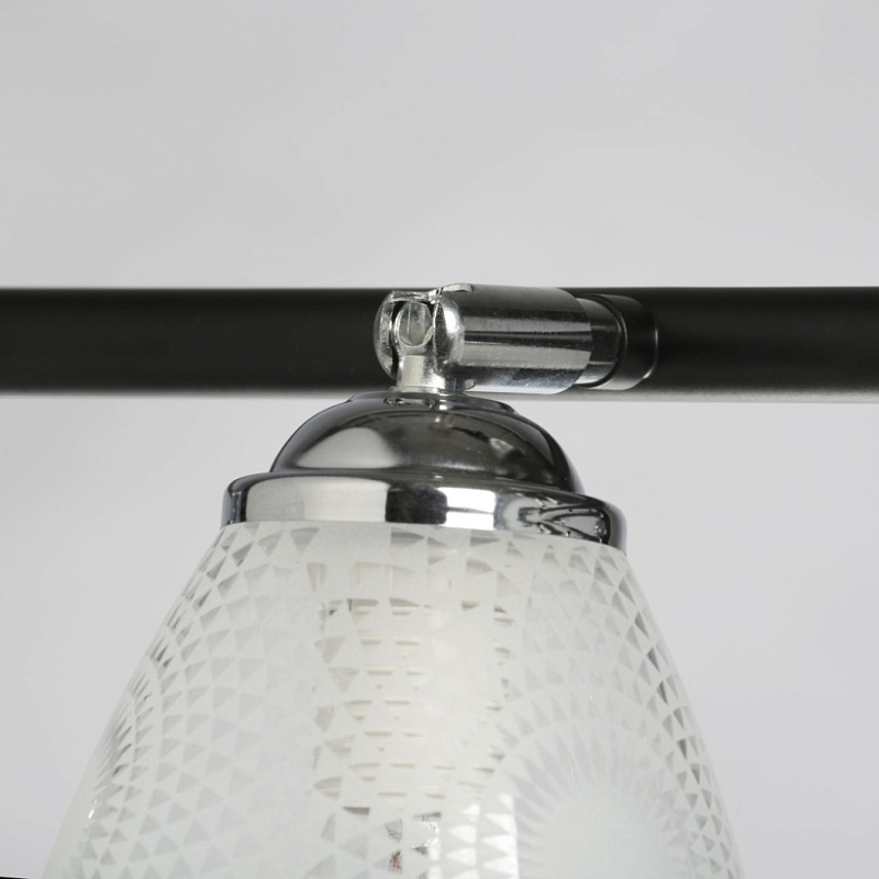 Основание светильника выполнено из металла. Потолочная чаша и рожки окрашены в черный цвет, штанги и держатели плафонов гальванизированы в цвет хрома. Стеклянные плафоны отлиты в форму и матированы по трафарету с оригинальным рисунком.