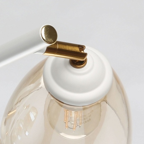 Металлическое основание потолочного светильника окрашено в белый цвет. Отдельные элементы гальванизированы в цвет матовой бронзы. Стеклянные плафоны гальванизированы в цвет шампань.