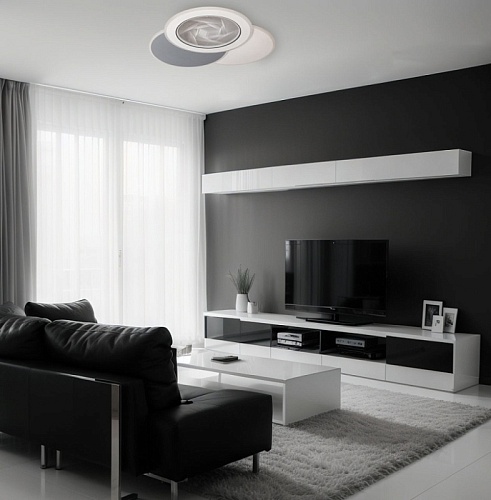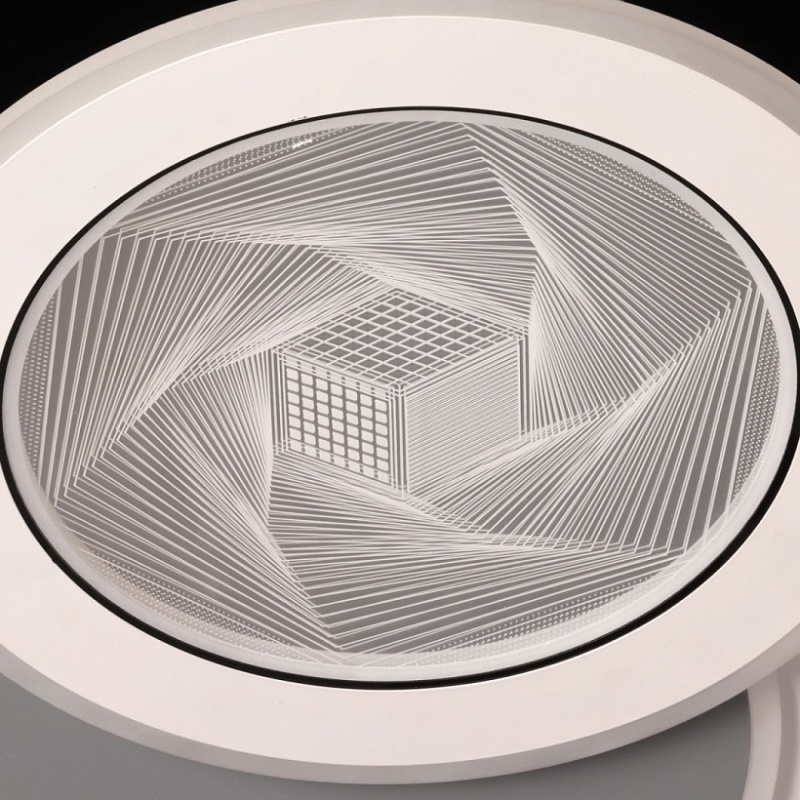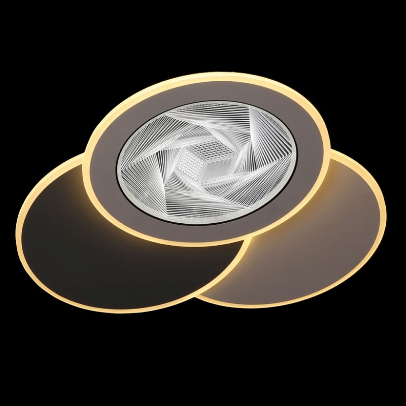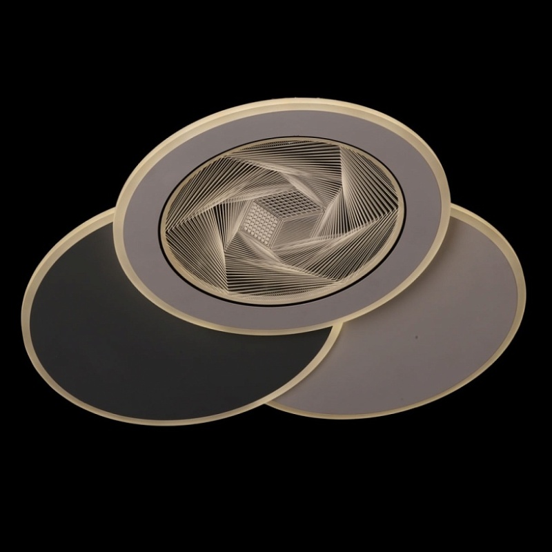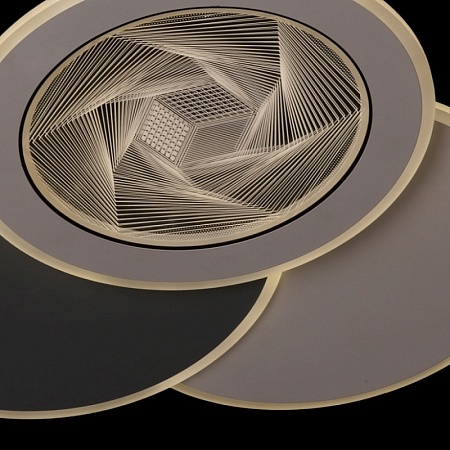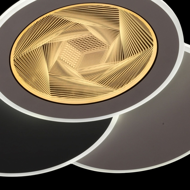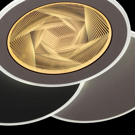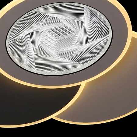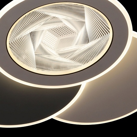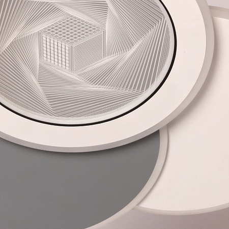 Металлическое основание потолочной люстры окрашено в белый цвет. Корпус плафонов выполнен из сплава алюминия с цинком и окрашен в белый и серый цвета. Светодиодные источники света закрыты матовым акрилом с 3D-эффектом.